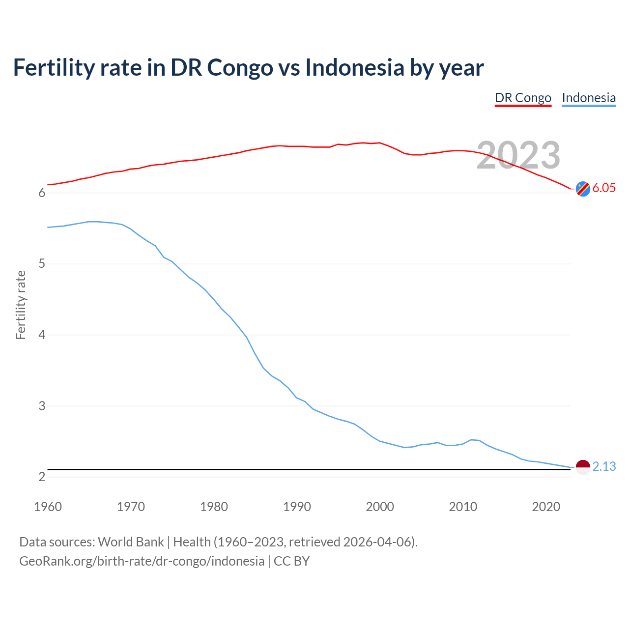 1960 vs 2023, the fertility rate has decreased by 0.88% in the DR Congo and by 61.4% in Indonesia — in 1960, it was 6.11 and 5.51, respectively.