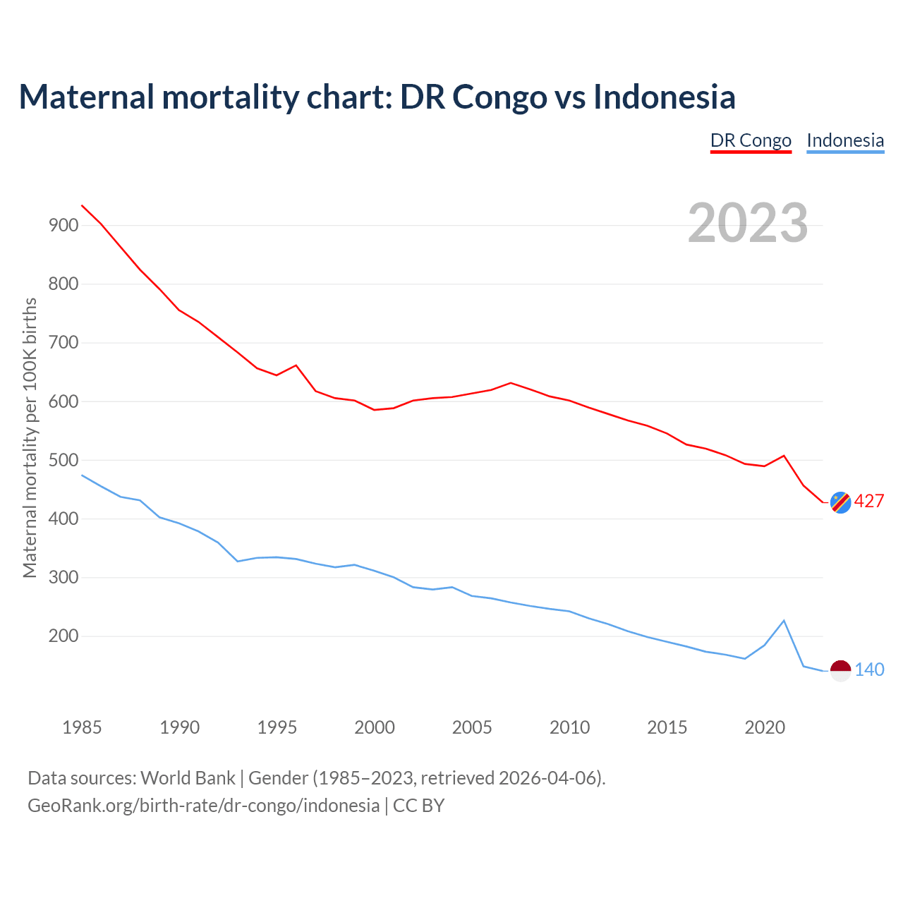 The maternal mortality rate, which is the probability of dying during childbirth or within 42 days of pregnancy termination, is 427 deaths per 100,000 live births in the DR Congo, compared to 140 deaths in Indonesia.
