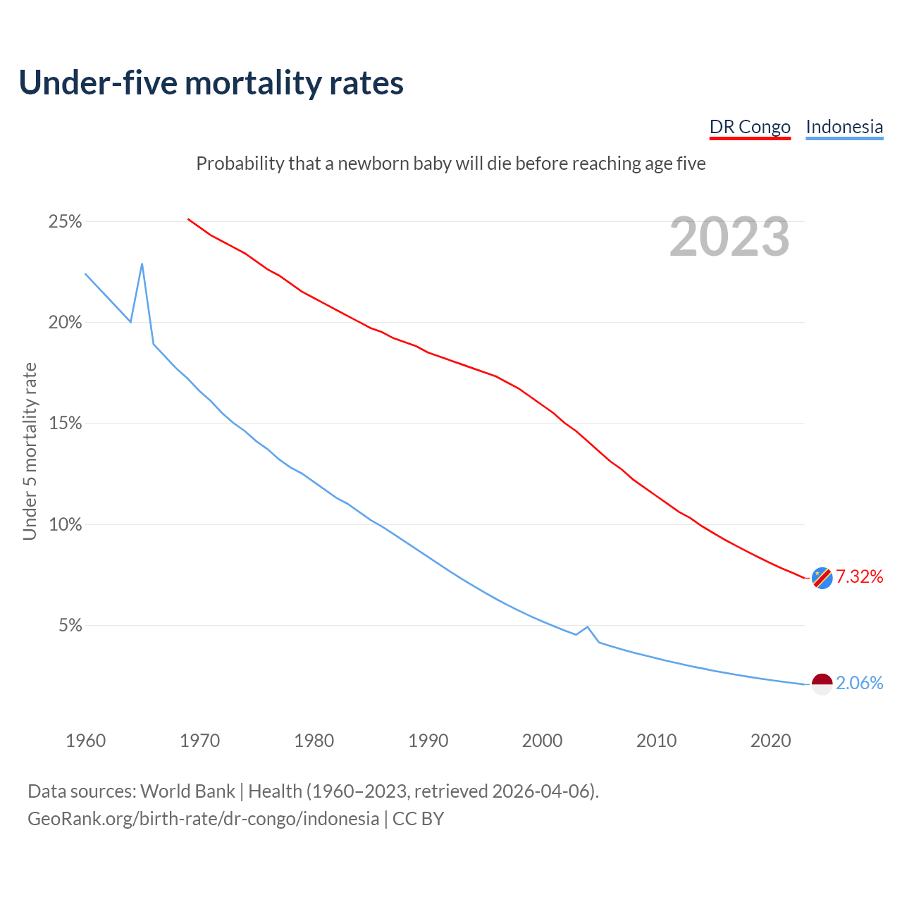 The chance that a newborn baby will die before reaching age five is 7.32% in the DR Congo and 2.06% in Indonesia. Above is a chart with historical data on under-five mortality rates.