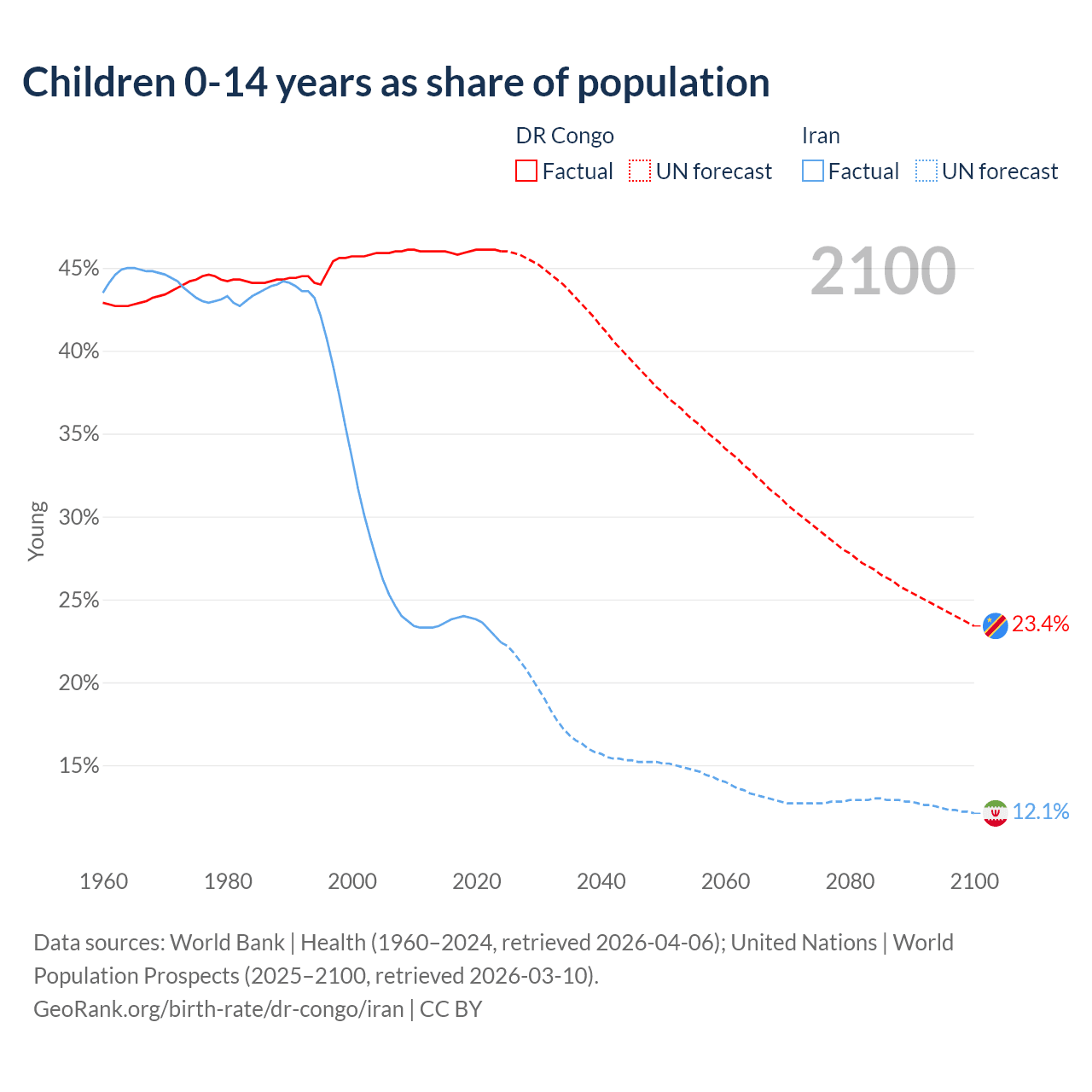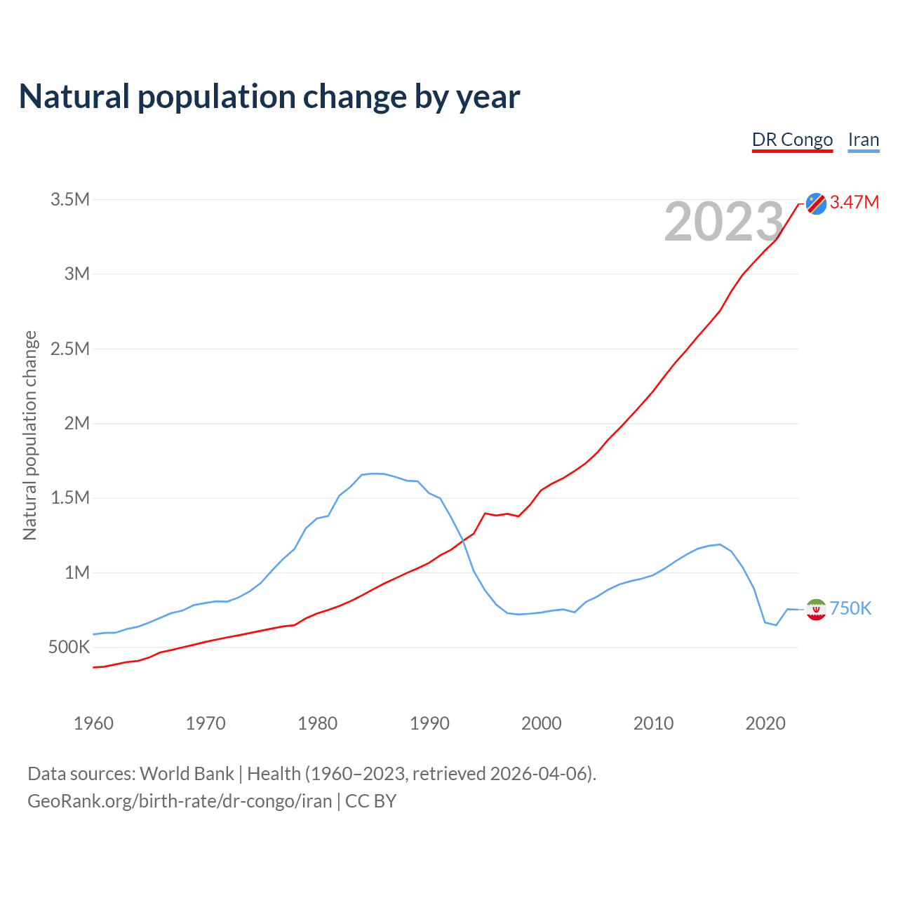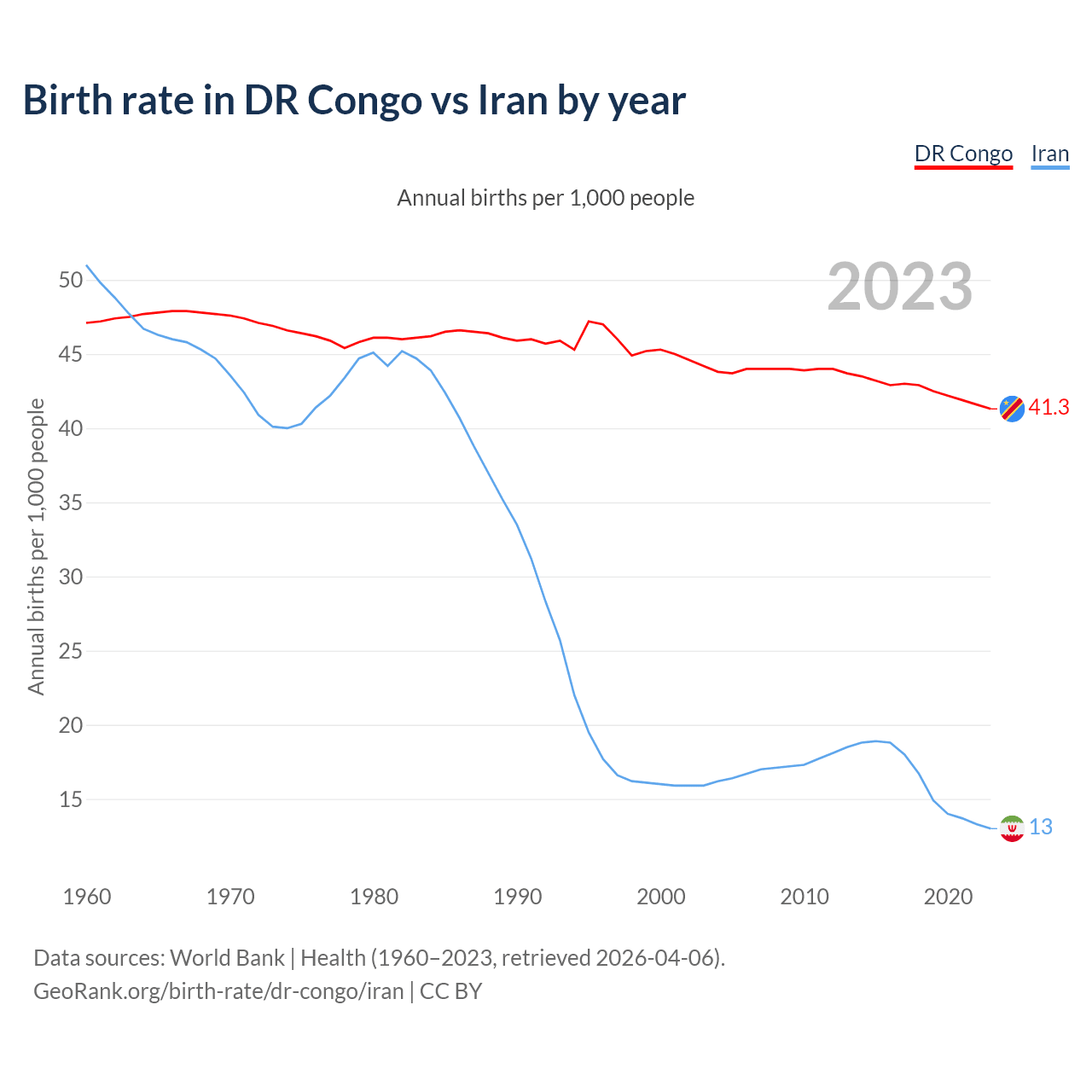 According to the latest available data on birth rates, the fertility rate in the DR Congo was 6.05 children per woman in 2023, compared to 1.7 in Iran in 2023. The replacement level is considered to be 2.1 children per woman.