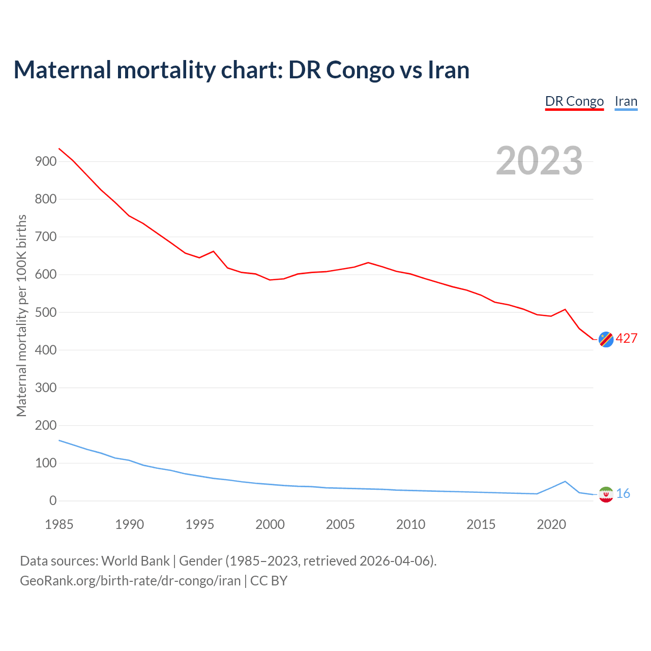 The maternal mortality rate, which is the probability of dying during childbirth or within 42 days of pregnancy termination, is 427 deaths per 100,000 live births in the DR Congo, compared to 16 deaths in Iran.