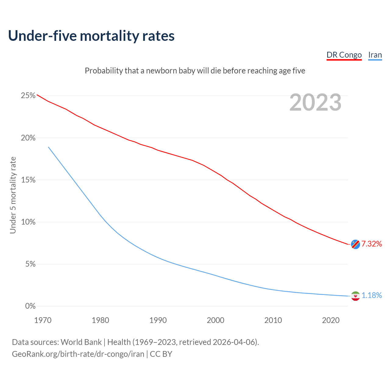 The chance that a newborn baby will die before reaching age five is 7.32% in the DR Congo and 1.18% in Iran. Above is a chart with historical data on under-five mortality rates.