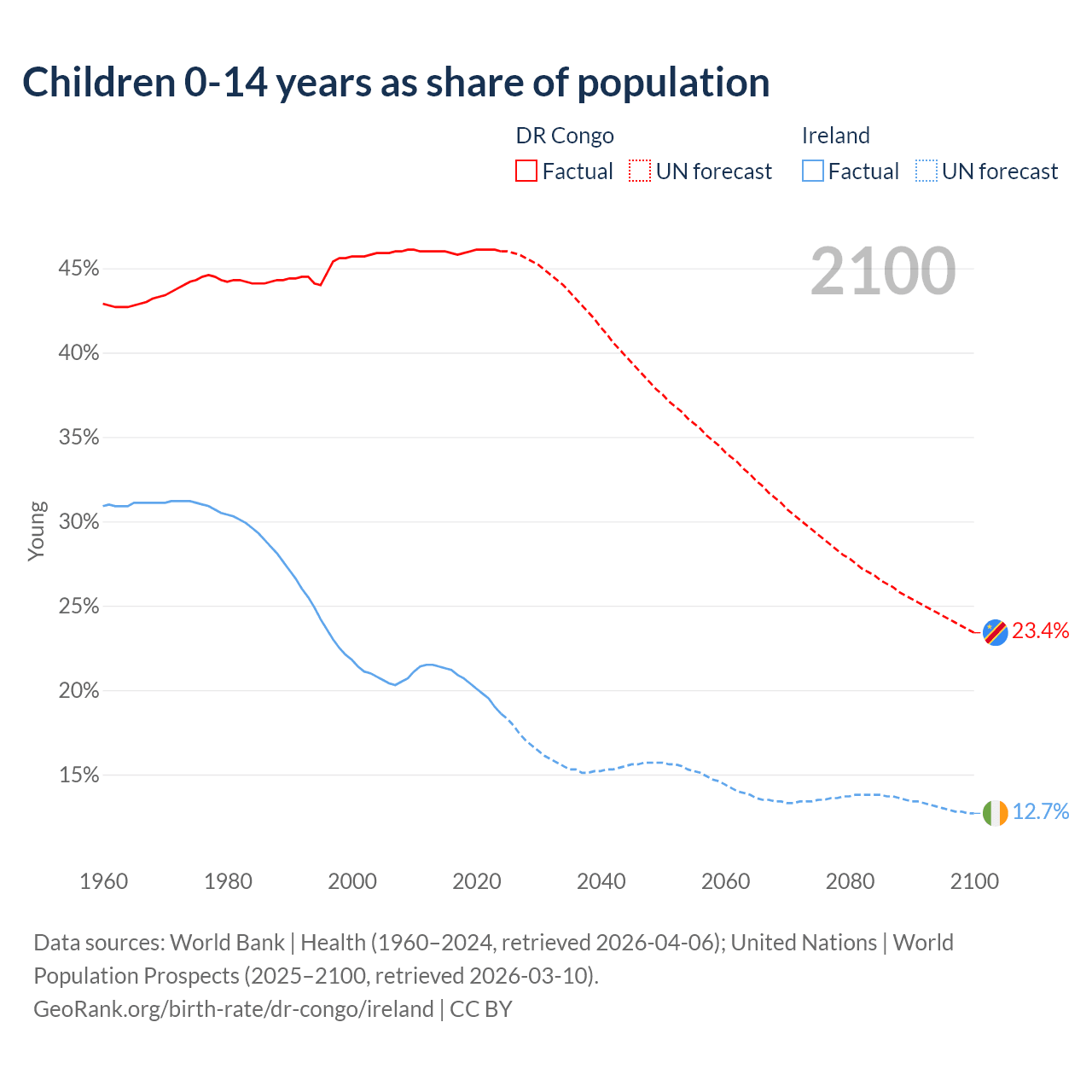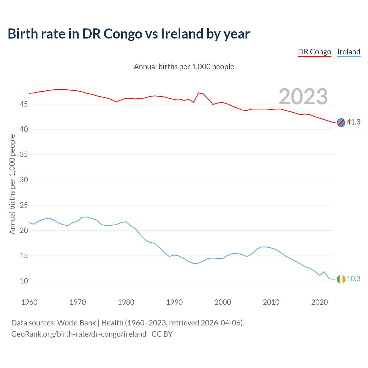 The DR Congo has an annual birth rate of 41.3 births per 1,000 people, compared to 10.3 for Ireland. The average number of children a woman is expected to have during her lifetime — the fertility rate, is 6.05 in the DR Congo and 1.5 in Ireland — 75.2% difference.