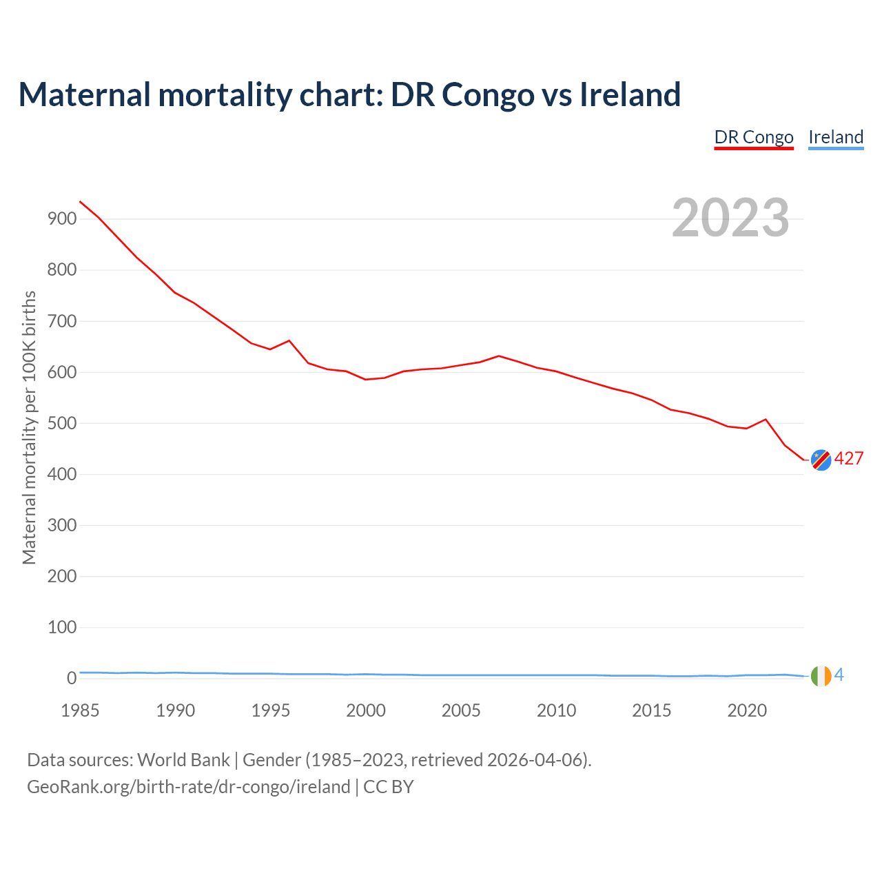 The maternal mortality rate, which is the probability of dying during childbirth or within 42 days of pregnancy termination, is 427 deaths per 100,000 live births in the DR Congo, compared to 4 deaths in Ireland.