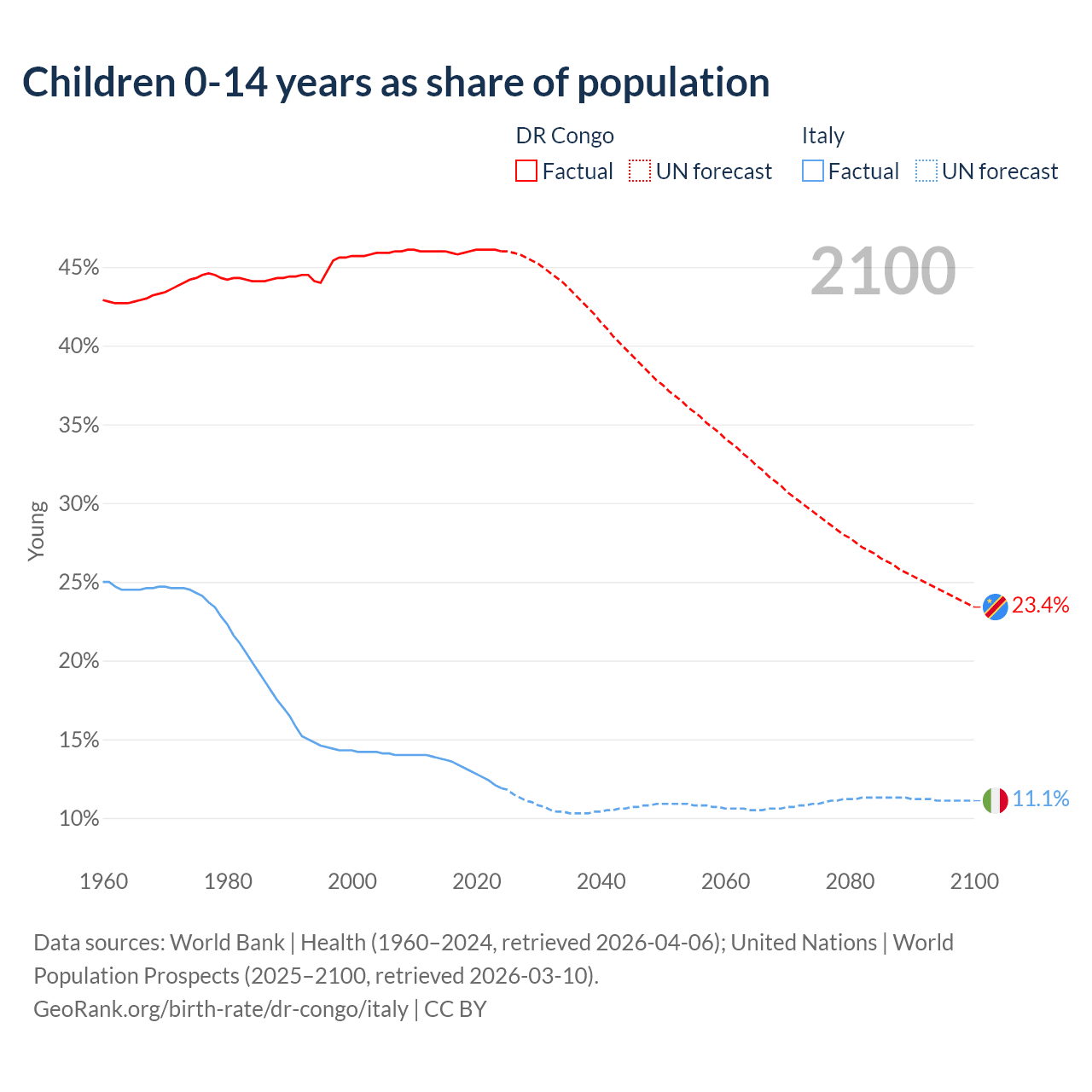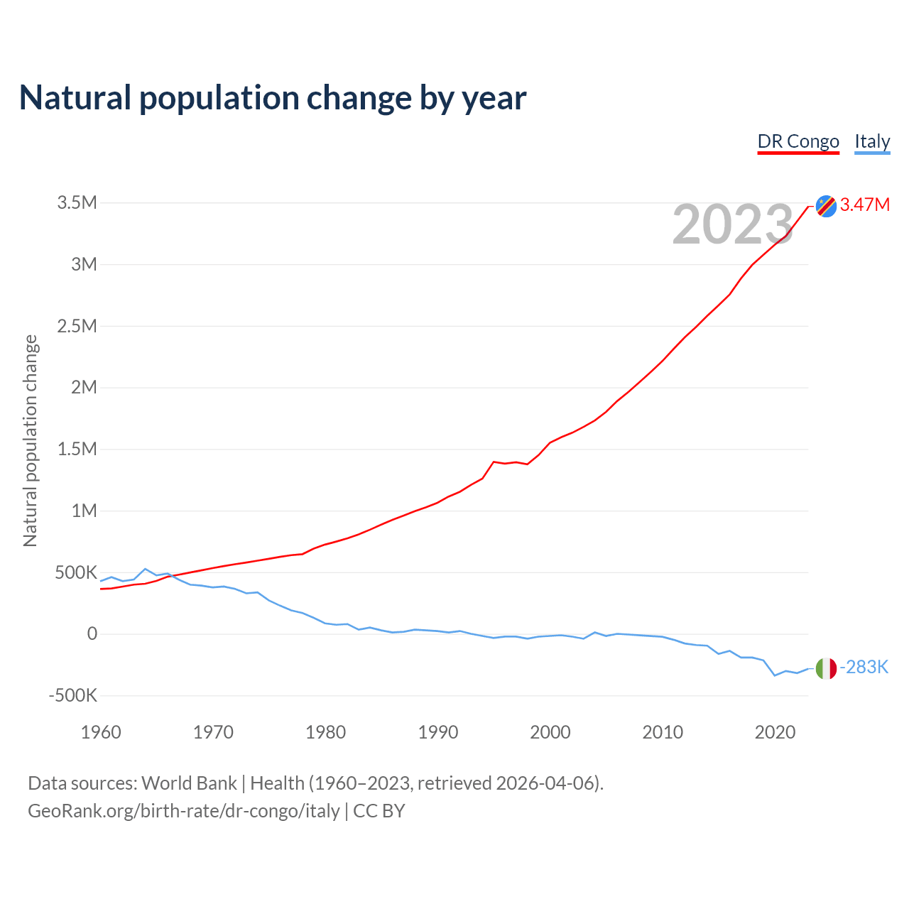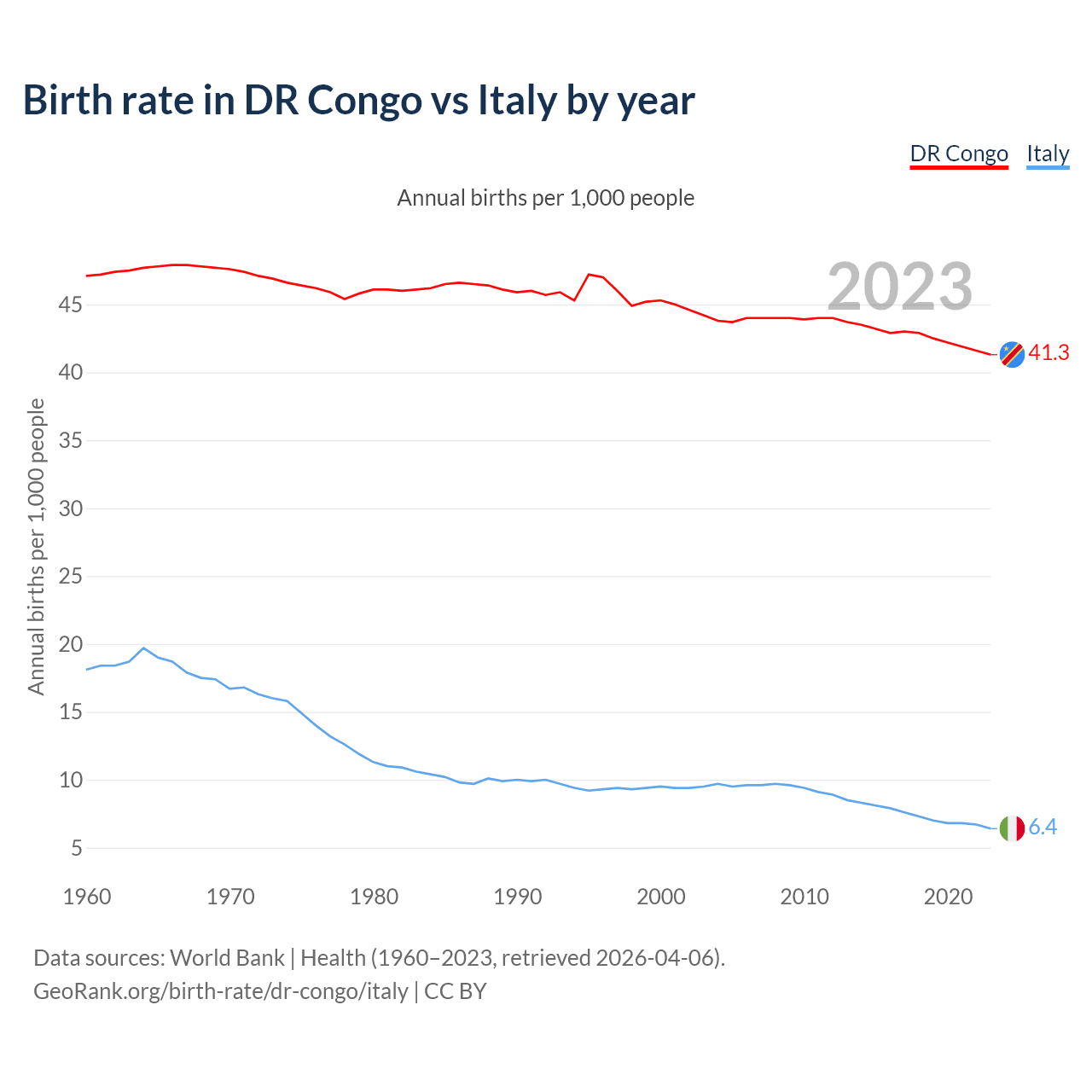 The DR Congo has an annual birth rate of 41.3 births per 1,000 people, compared to 6.4 for Italy. The average number of children a woman is expected to have during her lifetime — the fertility rate, is 6.05 in the DR Congo and 1.2 in Italy — 80.2% difference.