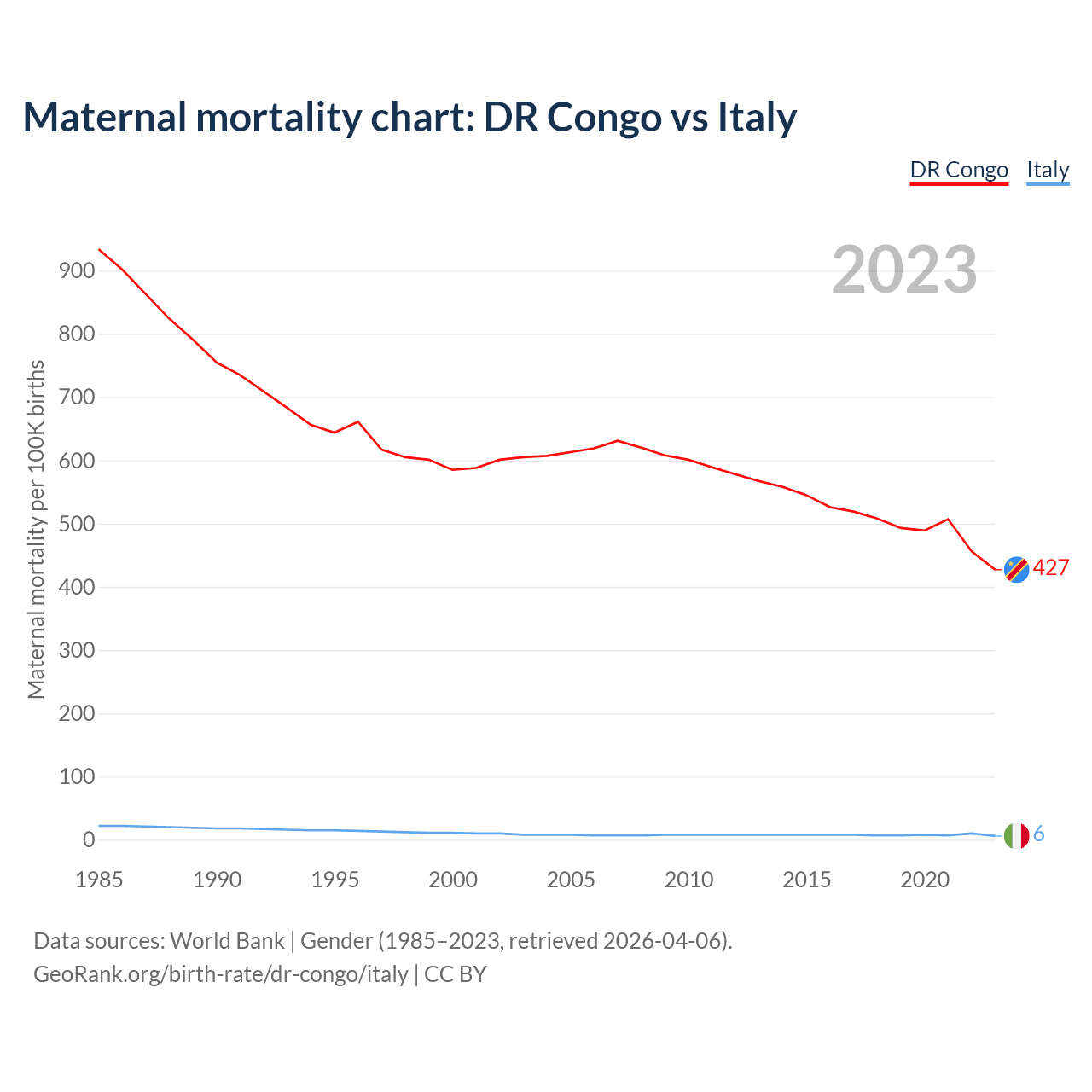 The maternal mortality rate, which is the probability of dying during childbirth or within 42 days of pregnancy termination, is 427 deaths per 100,000 live births in the DR Congo, compared to 6 deaths in Italy.