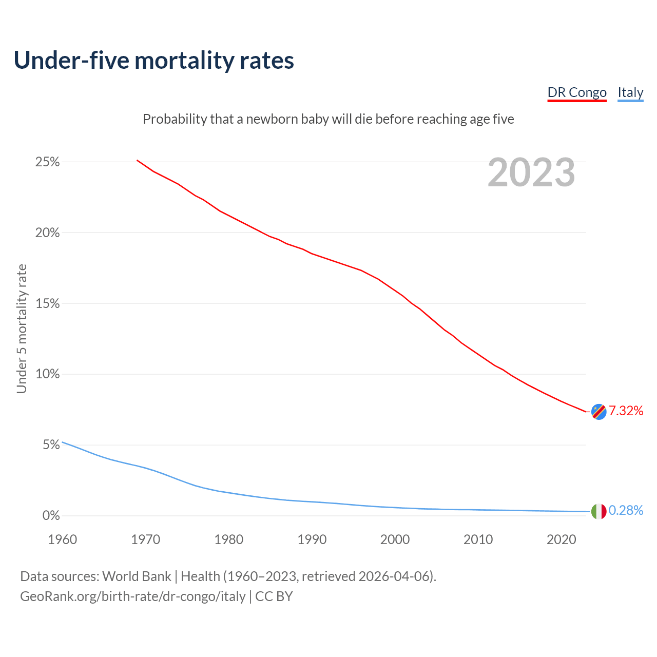 The chance that a newborn baby will die before reaching age five is 7.32% in the DR Congo and 0.28% in Italy. Above is a chart with historical data on under-five mortality rates.