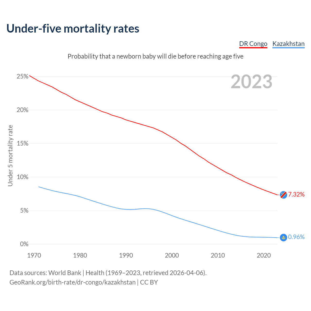The chance that a newborn baby will die before reaching age five is 7.32% in the DR Congo and 0.96% in Kazakhstan. Above is a chart with historical data on under-five mortality rates.