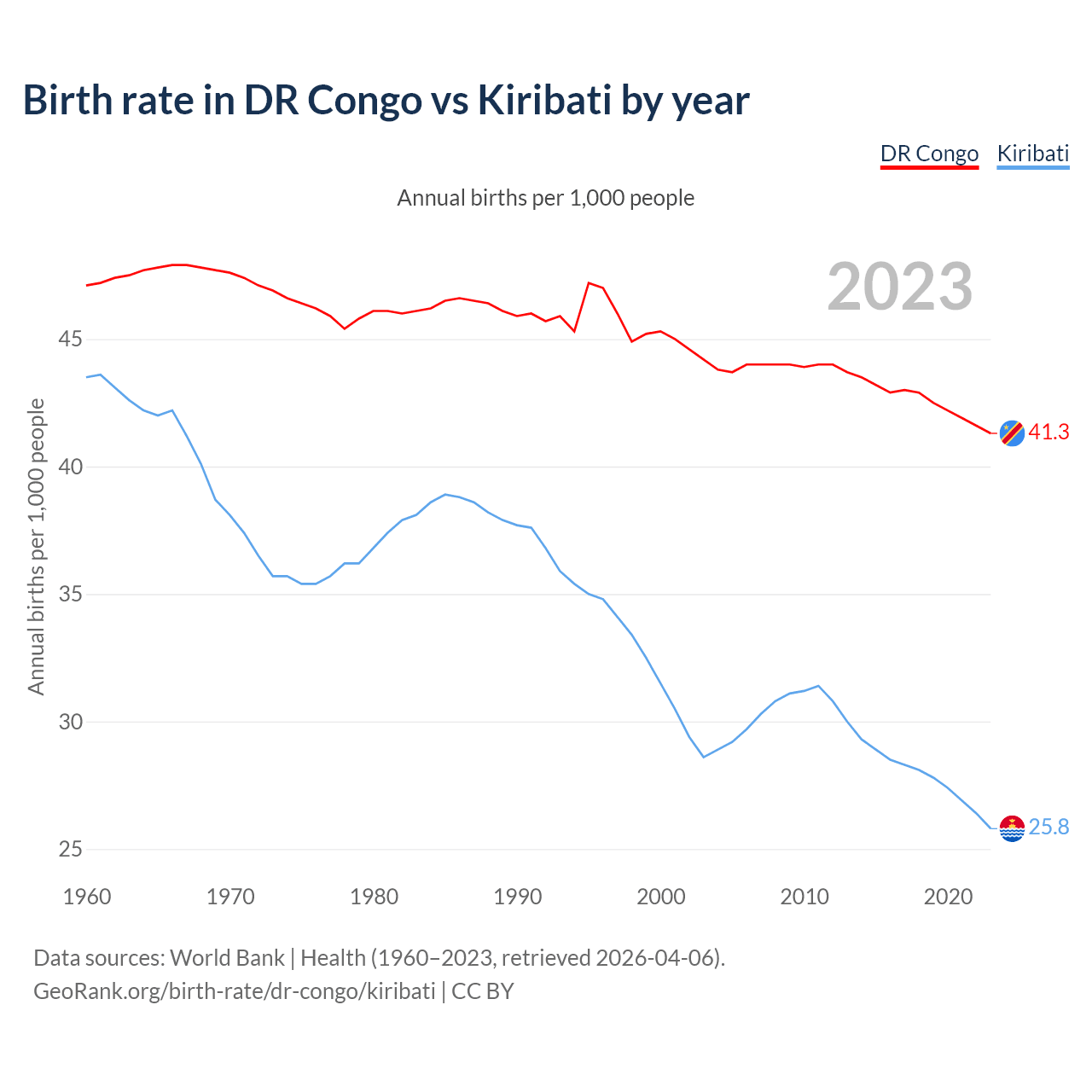 The DR Congo has an annual birth rate of 41.3 births per 1,000 people, compared to 25.8 for Kiribati. The average number of children a woman is expected to have during her lifetime — the fertility rate, is 6.05 in the DR Congo and 3.15 in Kiribati — 48% difference.
