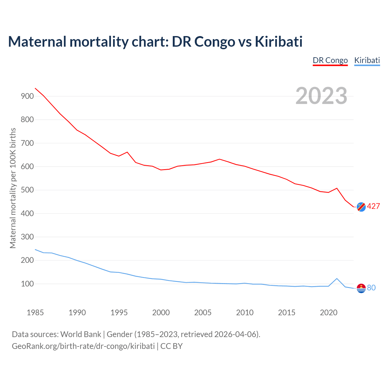 The maternal mortality rate, which is the probability of dying during childbirth or within 42 days of pregnancy termination, is 427 deaths per 100,000 live births in the DR Congo, compared to 80 deaths in Kiribati.