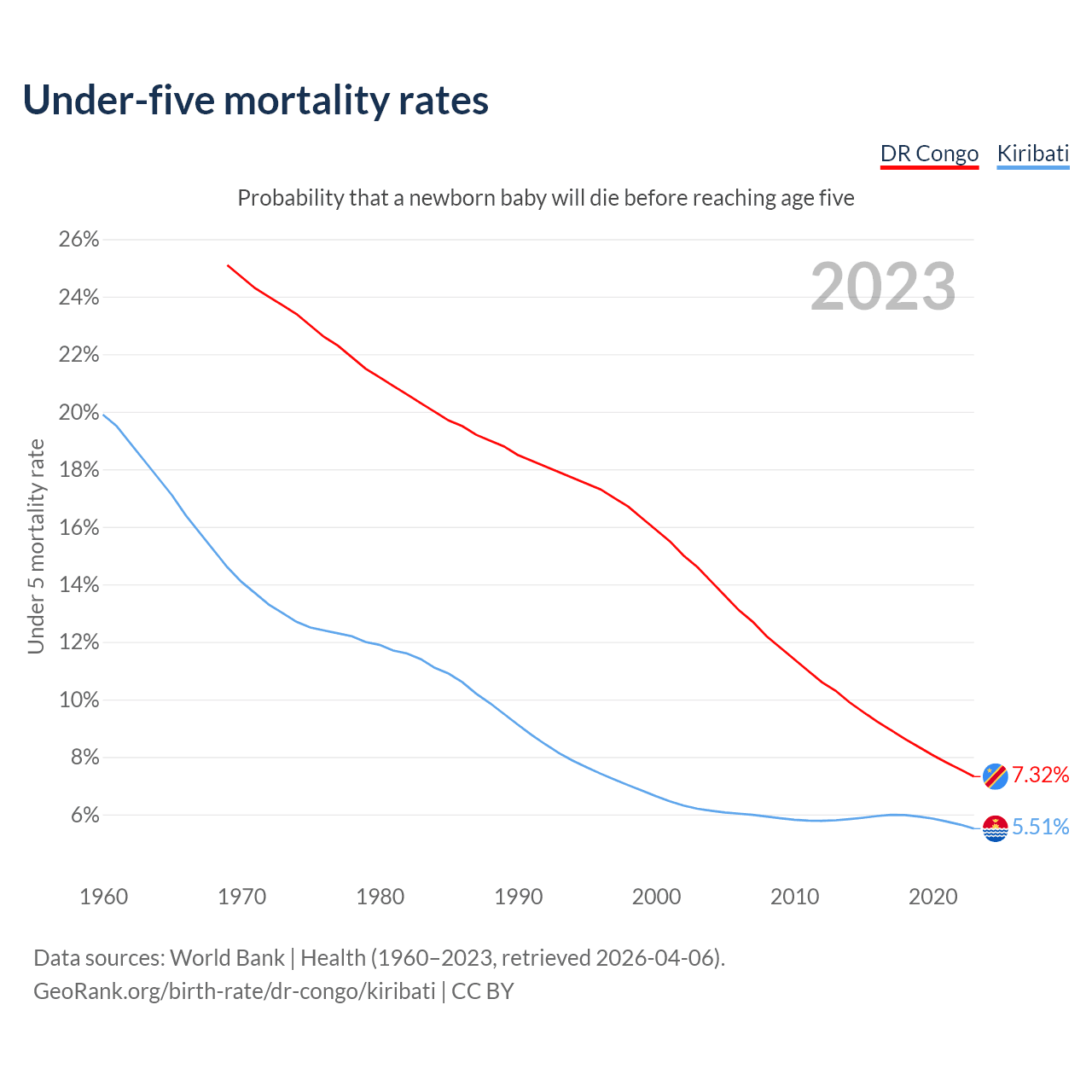 The chance that a newborn baby will die before reaching age five is 7.32% in the DR Congo and 5.51% in Kiribati. Above is a chart with historical data on under-five mortality rates.