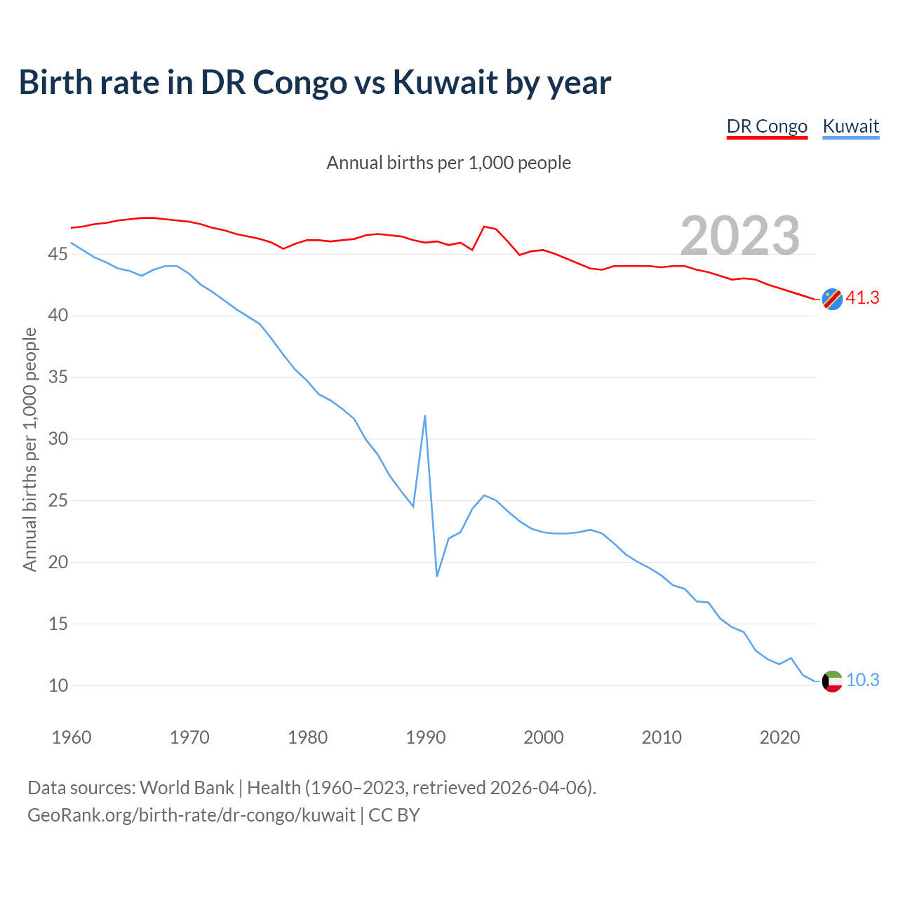 The DR Congo has an annual birth rate of 41.3 births per 1,000 people, compared to 10.3 for Kuwait. The average number of children a woman is expected to have during her lifetime — the fertility rate, is 6.05 in the DR Congo and 1.52 in Kuwait — 74.8% difference.