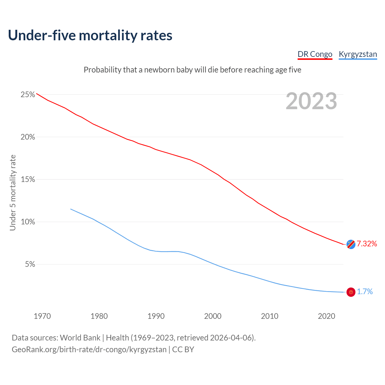 The chance that a newborn baby will die before reaching age five is 7.32% in the DR Congo and 1.7% in Kyrgyzstan. Above is a chart with historical data on under-five mortality rates.