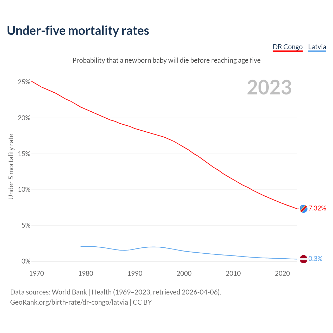 The chance that a newborn baby will die before reaching age five is 7.32% in the DR Congo and 0.3% in Latvia. Above is a chart with historical data on under-five mortality rates.