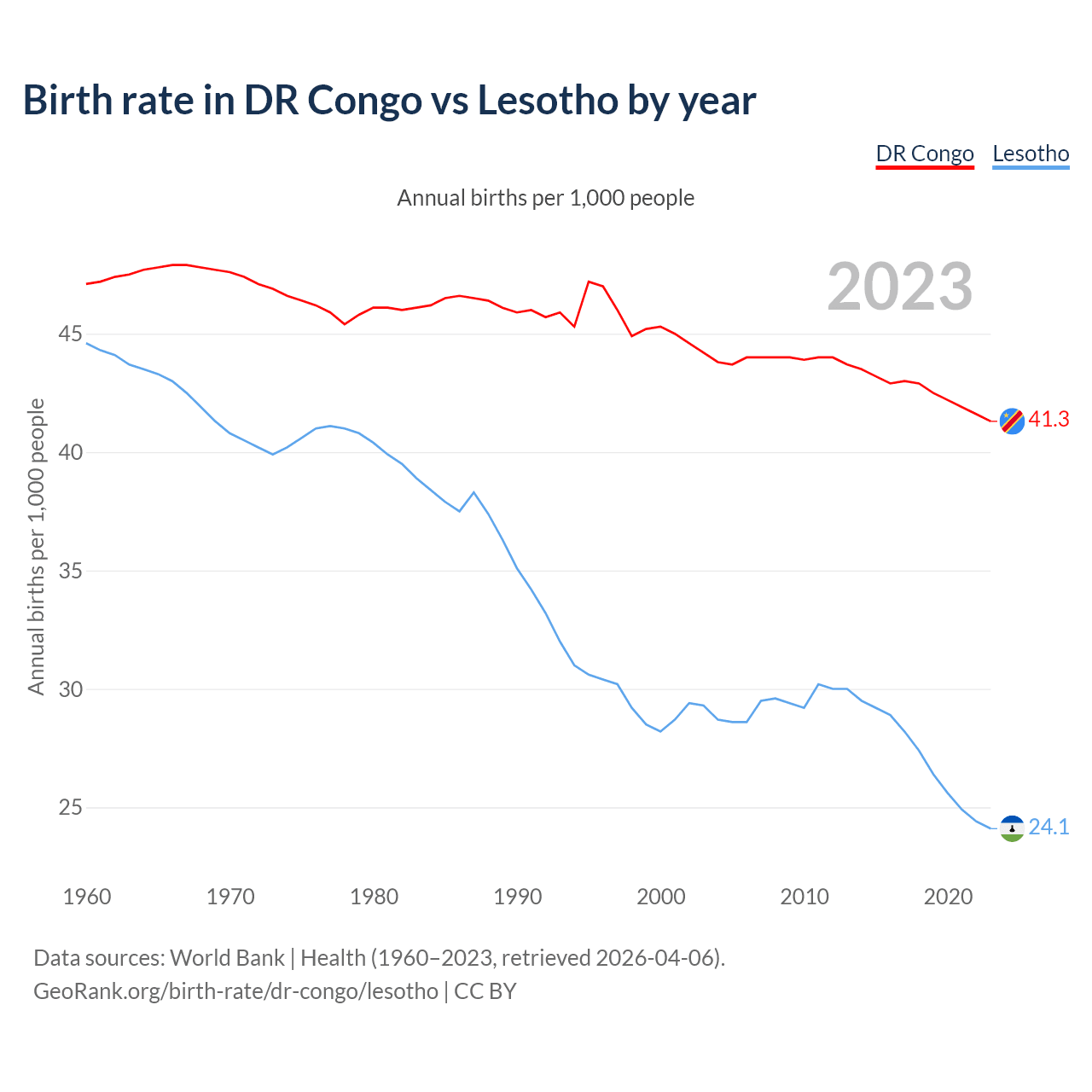The DR Congo has an annual birth rate of 41.3 births per 1,000 people, compared to 24.1 for Lesotho. The average number of children a woman is expected to have during her lifetime — the fertility rate, is 6.05 in the DR Congo and 2.69 in Lesotho — 55.5% difference.