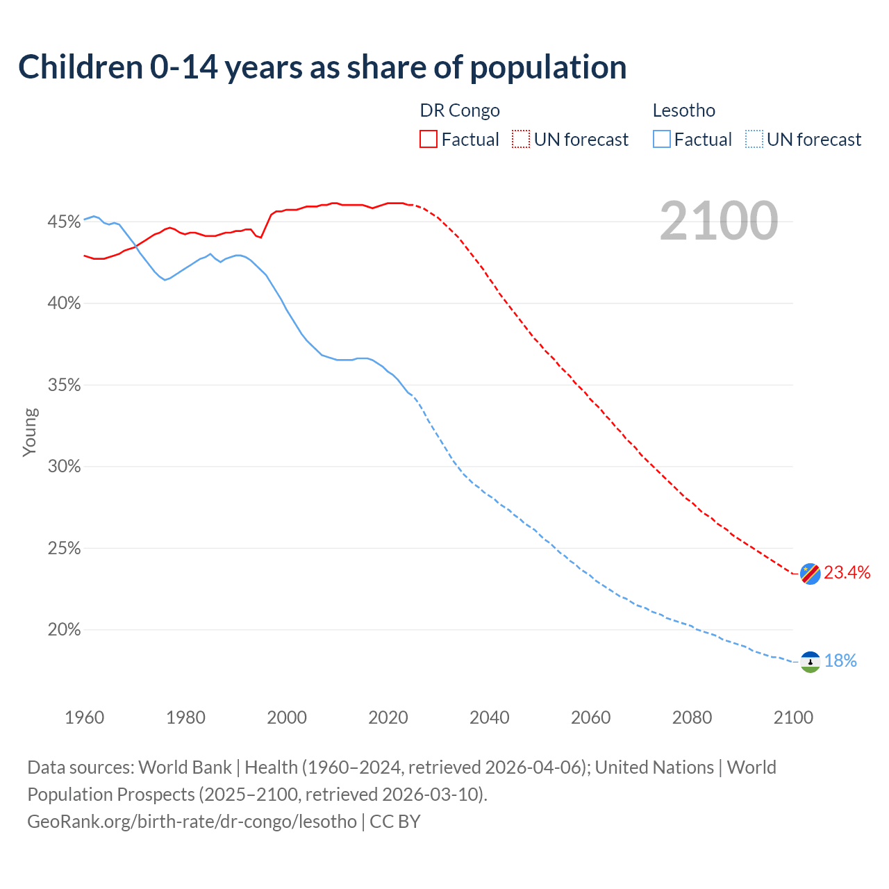 According to the latest available data on birth rates, the fertility rate in the DR Congo was 6.05 children per woman in 2023, compared to 2.69 in Lesotho in 2023. The replacement level is considered to be 2.1 children per woman.