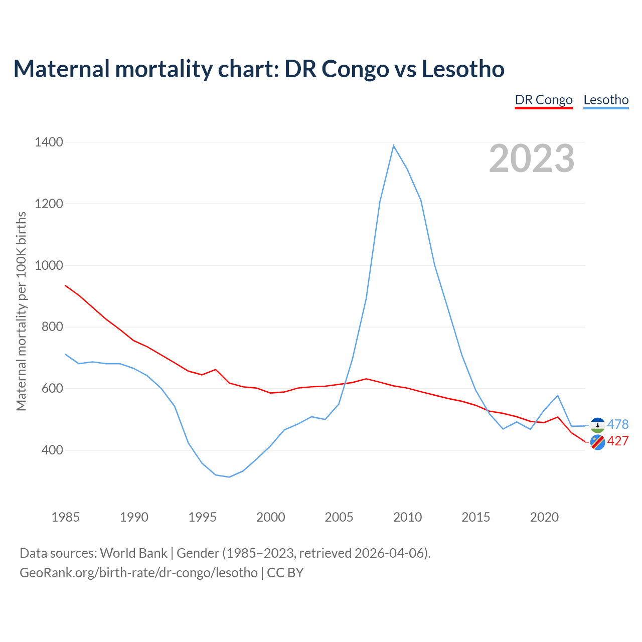 The maternal mortality rate, which is the probability of dying during childbirth or within 42 days of pregnancy termination, is 427 deaths per 100,000 live births in the DR Congo, compared to 478 deaths in Lesotho.