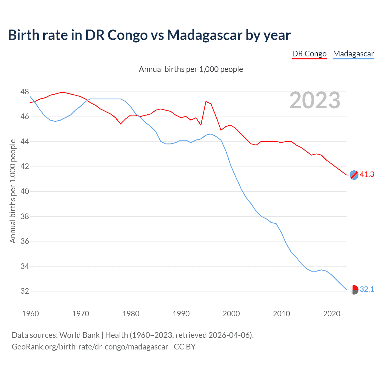 The DR Congo has an annual birth rate of 41.3 births per 1,000 people, compared to 32.1 for Madagascar. The average number of children a woman is expected to have during her lifetime — the fertility rate, is 6.05 in the DR Congo and 3.97 in Madagascar — 34.4% difference.