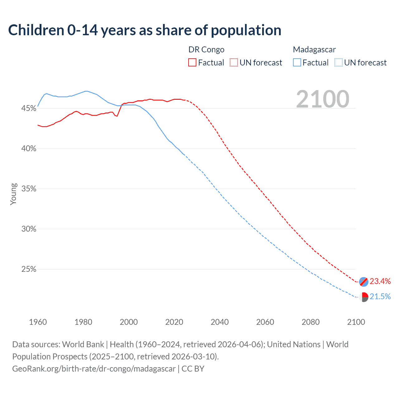 According to the latest available data on birth rates, the fertility rate in the DR Congo was 6.05 children per woman in 2023, compared to 3.97 in Madagascar in 2023. The replacement level is considered to be 2.1 children per woman.