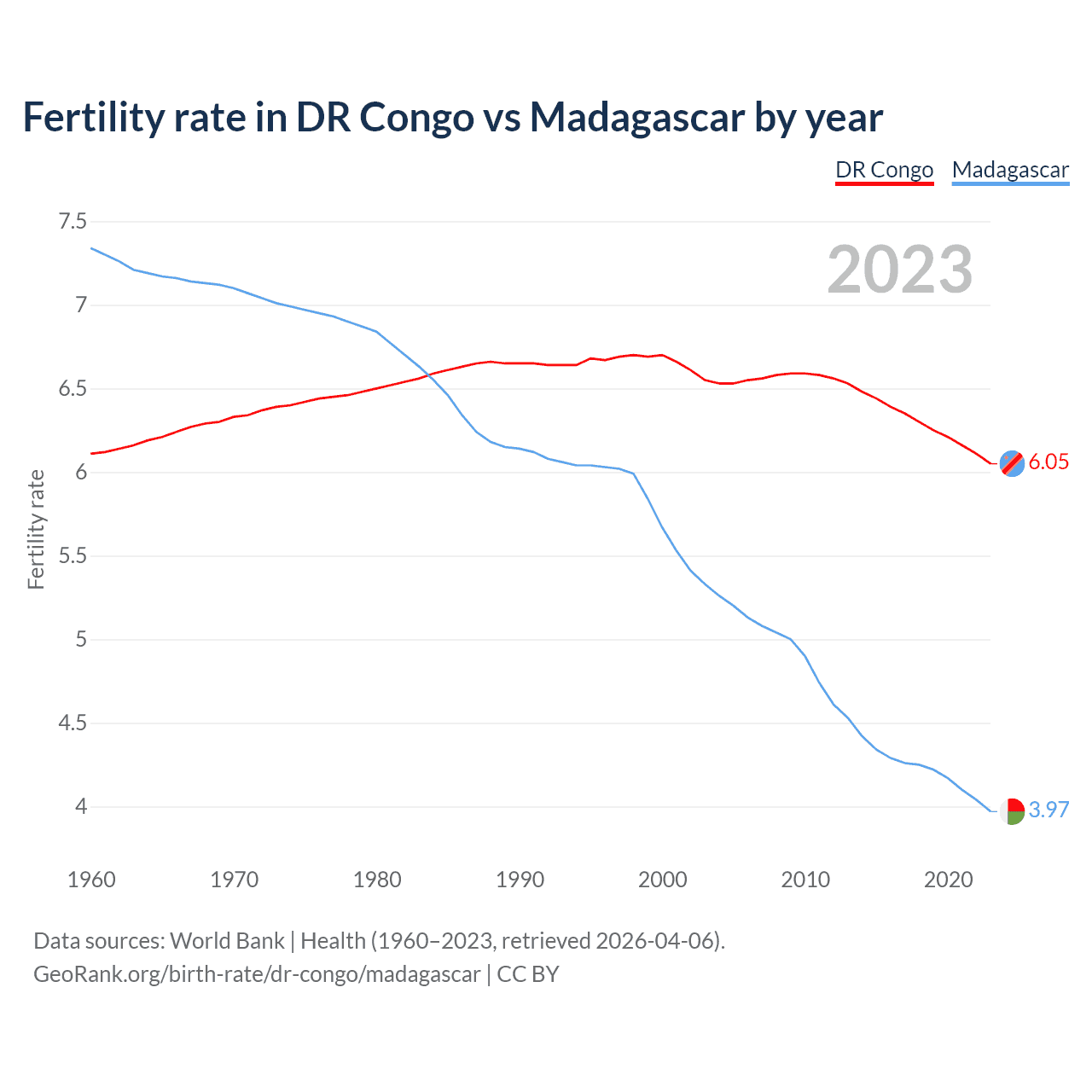 1960 vs 2023, the fertility rate has decreased by 0.88% in the DR Congo and by 45.9% in Madagascar — in 1960, it was 6.11 and 7.34, respectively.