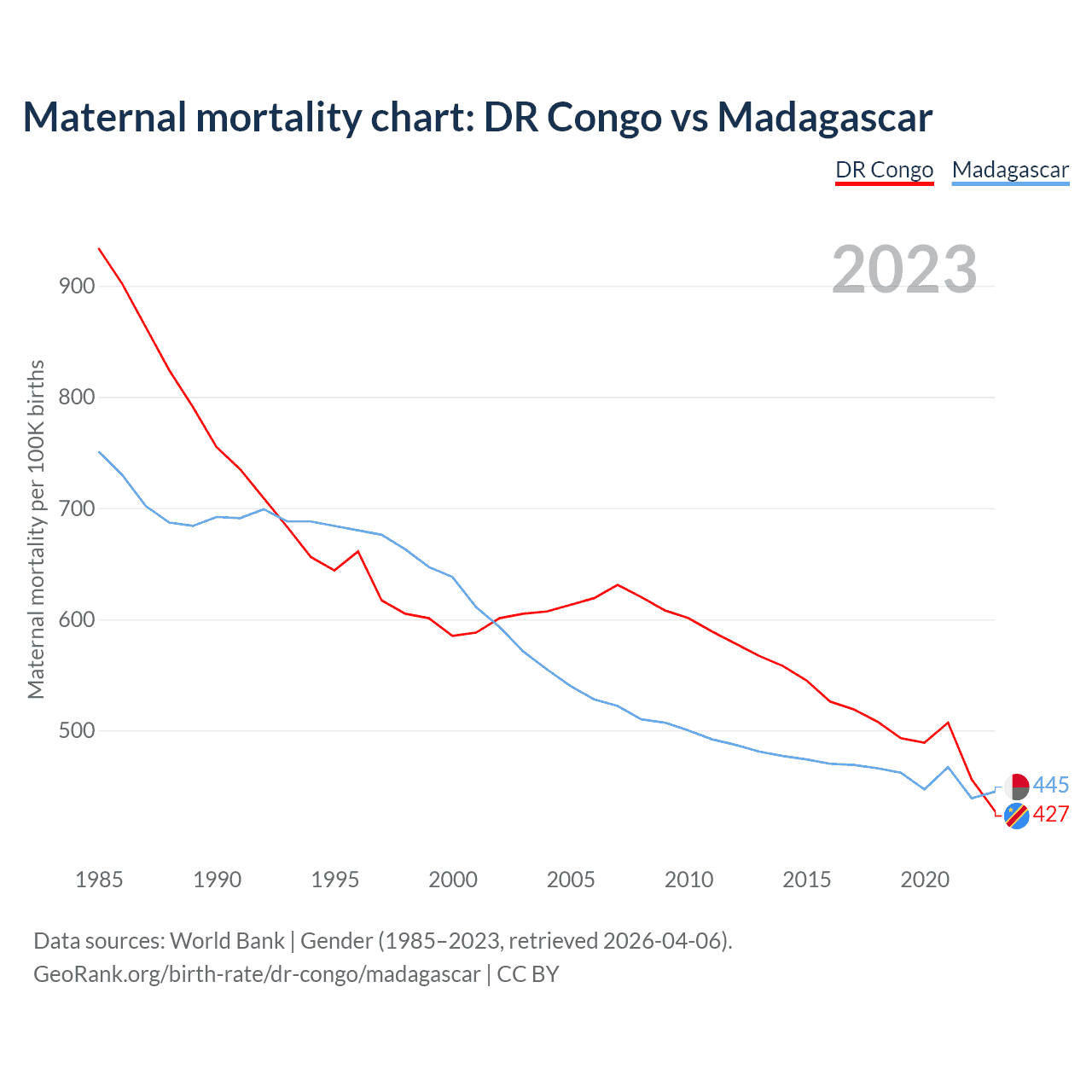 The maternal mortality rate, which is the probability of dying during childbirth or within 42 days of pregnancy termination, is 427 deaths per 100,000 live births in the DR Congo, compared to 445 deaths in Madagascar.