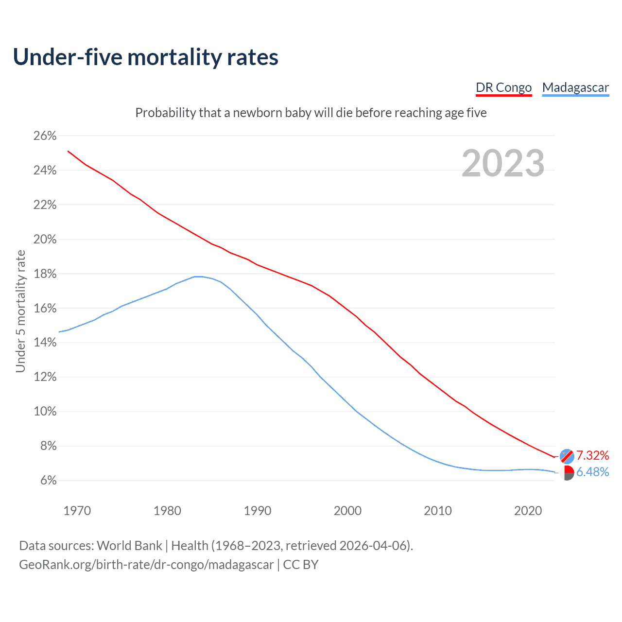 The chance that a newborn baby will die before reaching age five is 7.32% in the DR Congo and 6.48% in Madagascar. Above is a chart with historical data on under-five mortality rates.