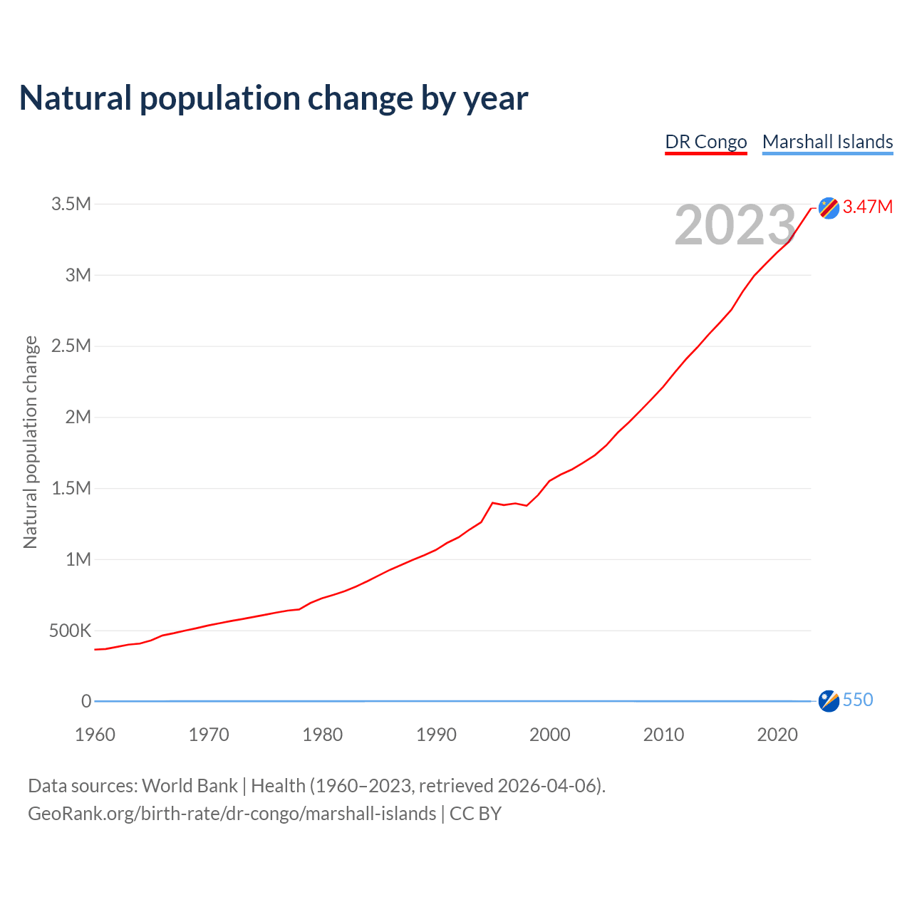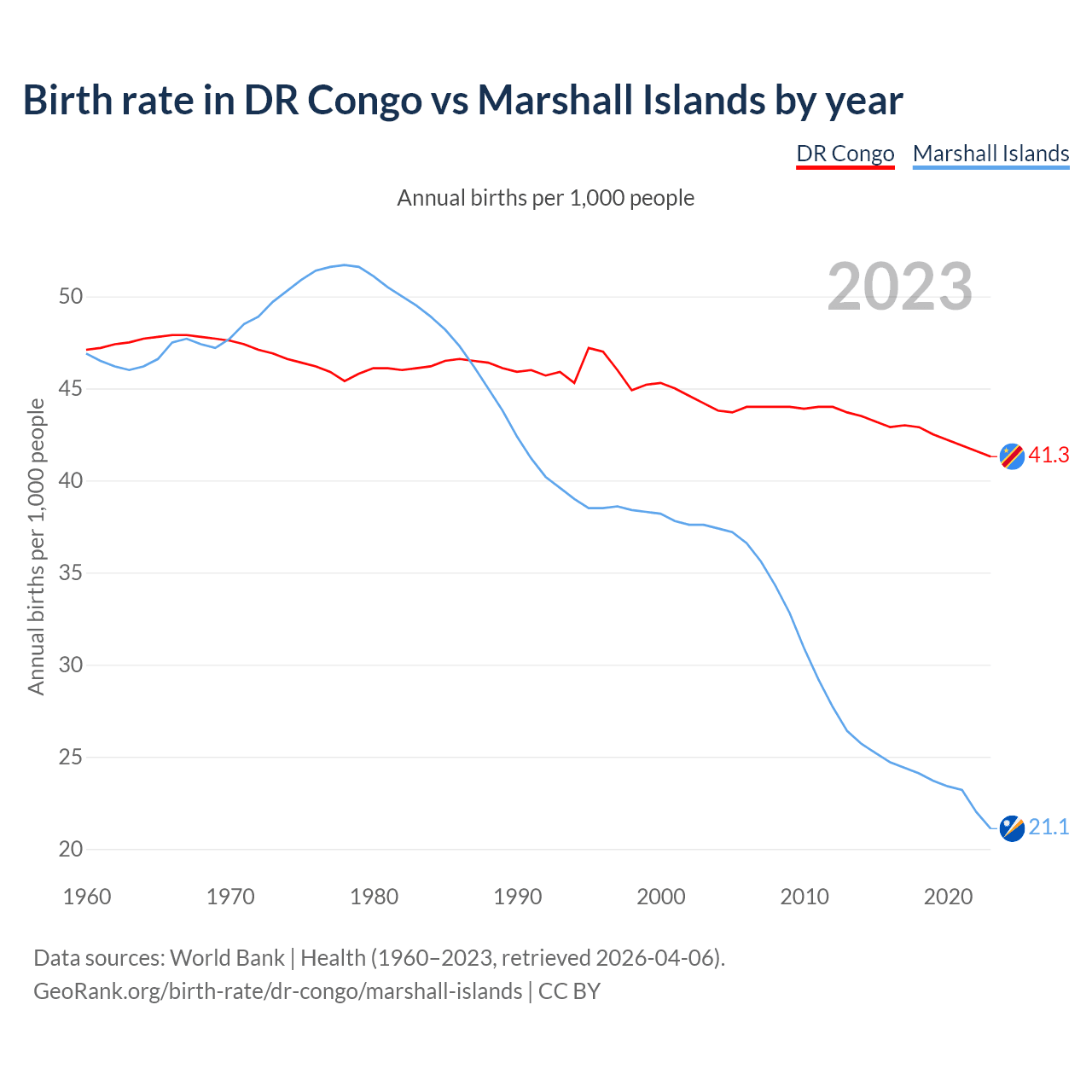 The DR Congo has an annual birth rate of 41.3 births per 1,000 people, compared to 21.1 for the Marshall Islands. The average number of children a woman is expected to have during her lifetime — the fertility rate, is 6.05 in the DR Congo and 2.92 in the Marshall Islands — 51.8% difference.