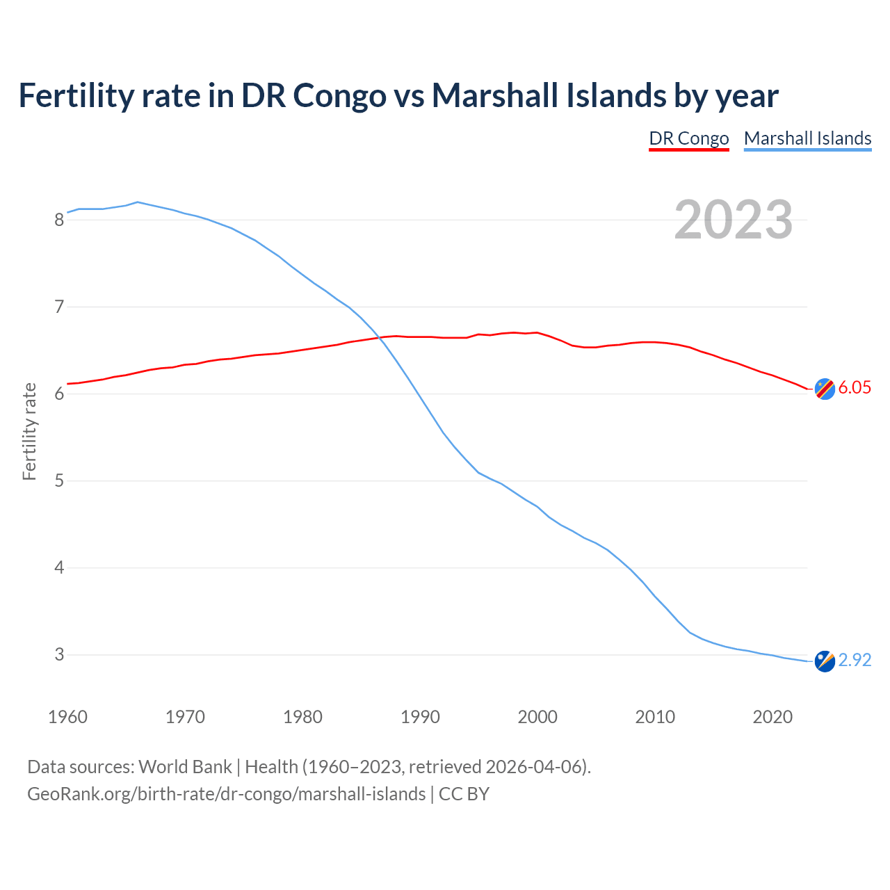 According to the latest available data on birth rates, the fertility rate in the DR Congo was 6.05 children per woman in 2023, compared to 2.92 in the Marshall Islands in 2023. The replacement level is considered to be 2.1 children per woman.