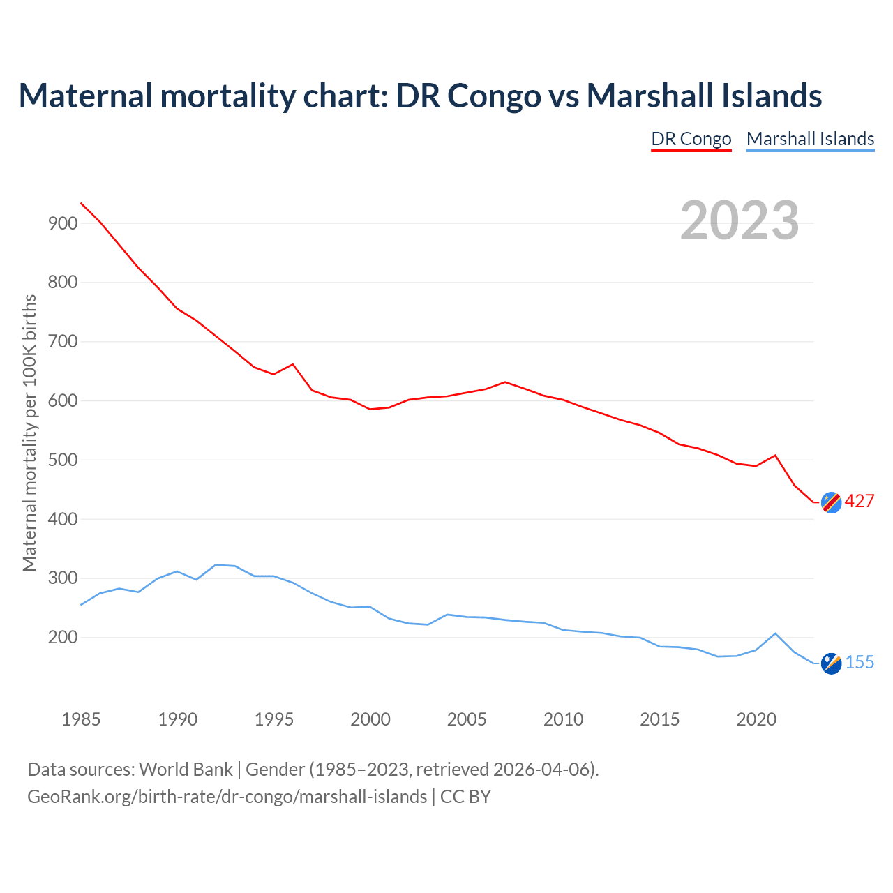The maternal mortality rate, which is the probability of dying during childbirth or within 42 days of pregnancy termination, is 427 deaths per 100,000 live births in the DR Congo, compared to 155 deaths in the Marshall Islands.