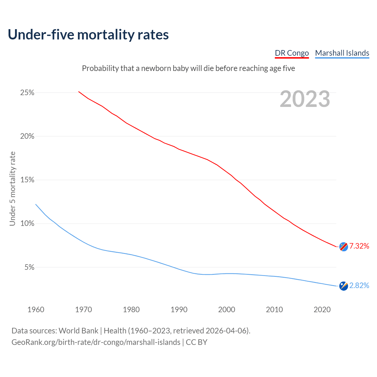 The chance that a newborn baby will die before reaching age five is 7.32% in the DR Congo and 2.82% in the Marshall Islands. Above is a chart with historical data on under-five mortality rates.
