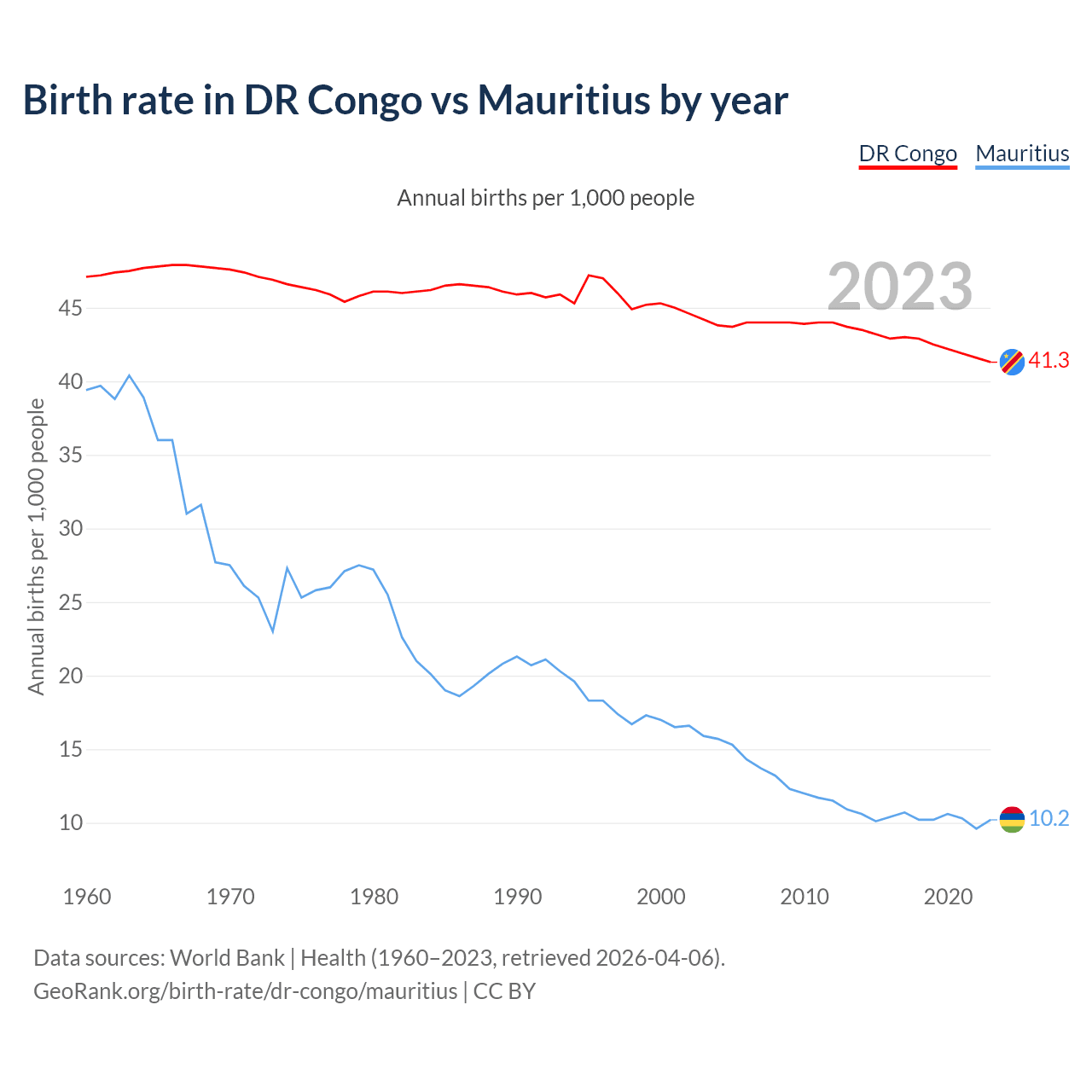 The DR Congo has an annual birth rate of 41.3 births per 1,000 people, compared to 10.2 for Mauritius. The average number of children a woman is expected to have during her lifetime — the fertility rate, is 6.05 in the DR Congo and 1.39 in Mauritius — 77% difference.