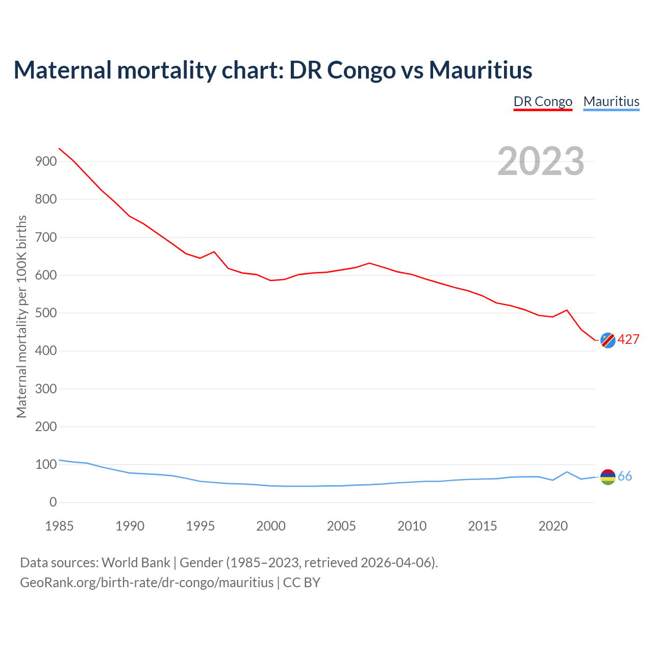 The maternal mortality rate, which is the probability of dying during childbirth or within 42 days of pregnancy termination, is 427 deaths per 100,000 live births in the DR Congo, compared to 66 deaths in Mauritius.