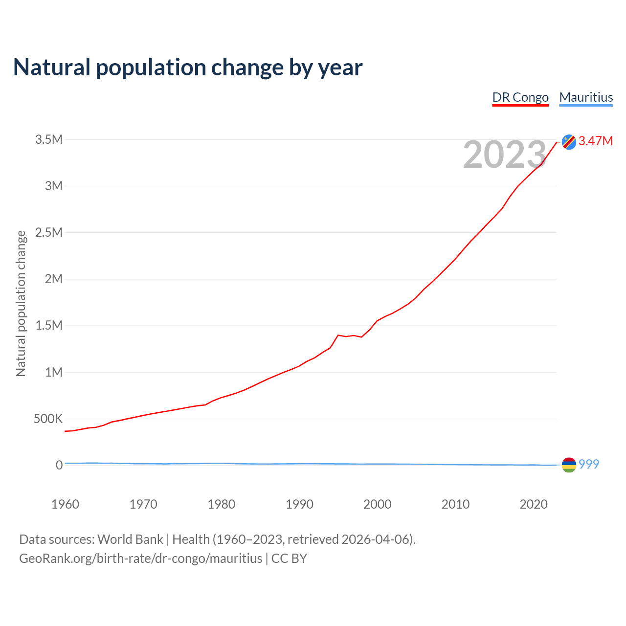 According to the latest available data on birth rates, the fertility rate in the DR Congo was 6.05 children per woman in 2023, compared to 1.39 in Mauritius in 2023. The replacement level is considered to be 2.1 children per woman.