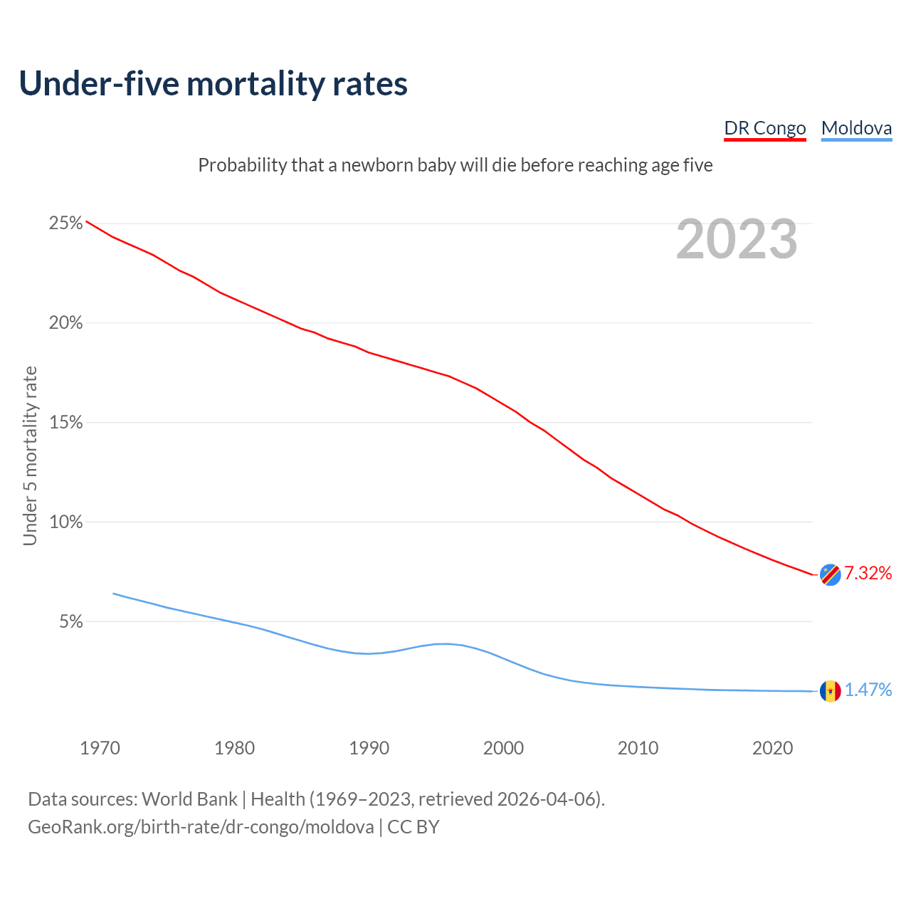 The chance that a newborn baby will die before reaching age five is 7.32% in the DR Congo and 1.47% in Moldova. Above is a chart with historical data on under-five mortality rates.