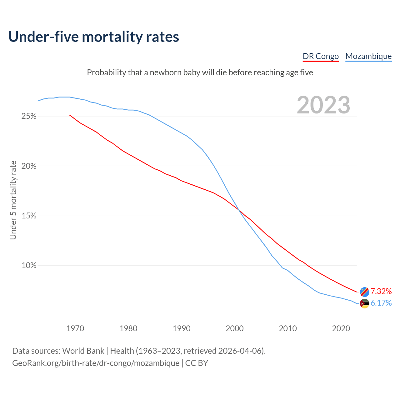 The chance that a newborn baby will die before reaching age five is 7.32% in the DR Congo and 6.17% in Mozambique. Above is a chart with historical data on under-five mortality rates.