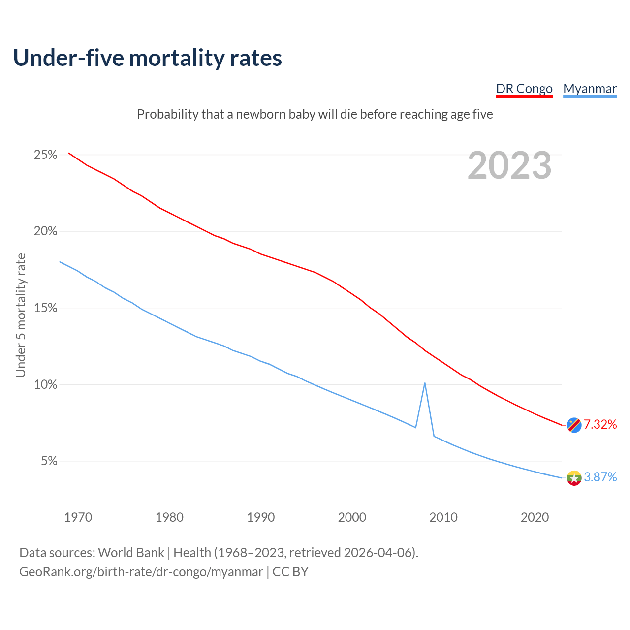 The chance that a newborn baby will die before reaching age five is 7.32% in the DR Congo and 3.87% in Myanmar. Above is a chart with historical data on under-five mortality rates.