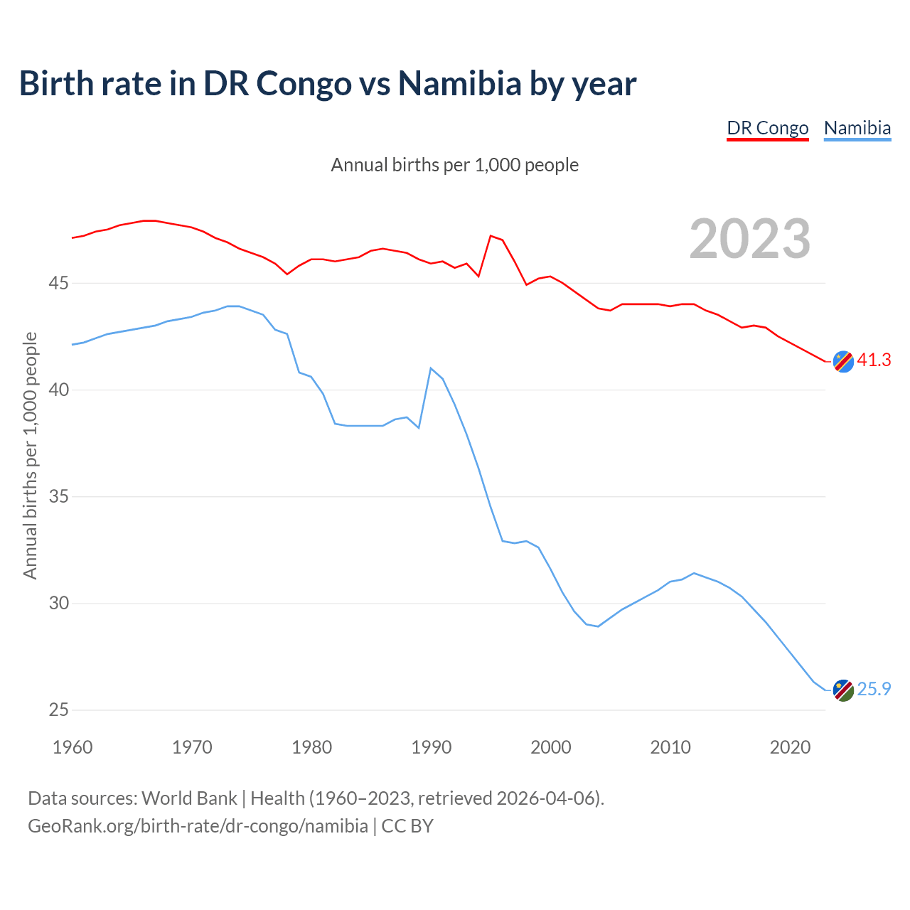 The DR Congo has an annual birth rate of 41.3 births per 1,000 people, compared to 25.9 for Namibia. The average number of children a woman is expected to have during her lifetime — the fertility rate, is 6.05 in the DR Congo and 3.21 in Namibia — 46.9% difference.