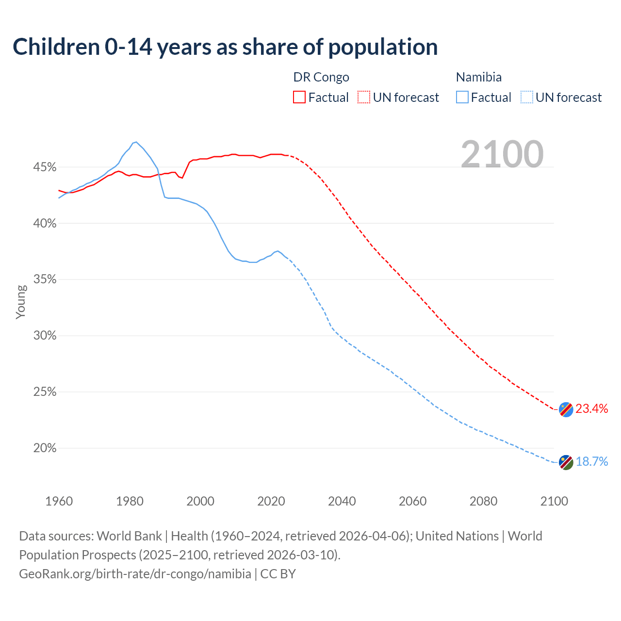According to the latest available data on birth rates, the fertility rate in the DR Congo was 6.05 children per woman in 2023, compared to 3.21 in Namibia in 2023. The replacement level is considered to be 2.1 children per woman.