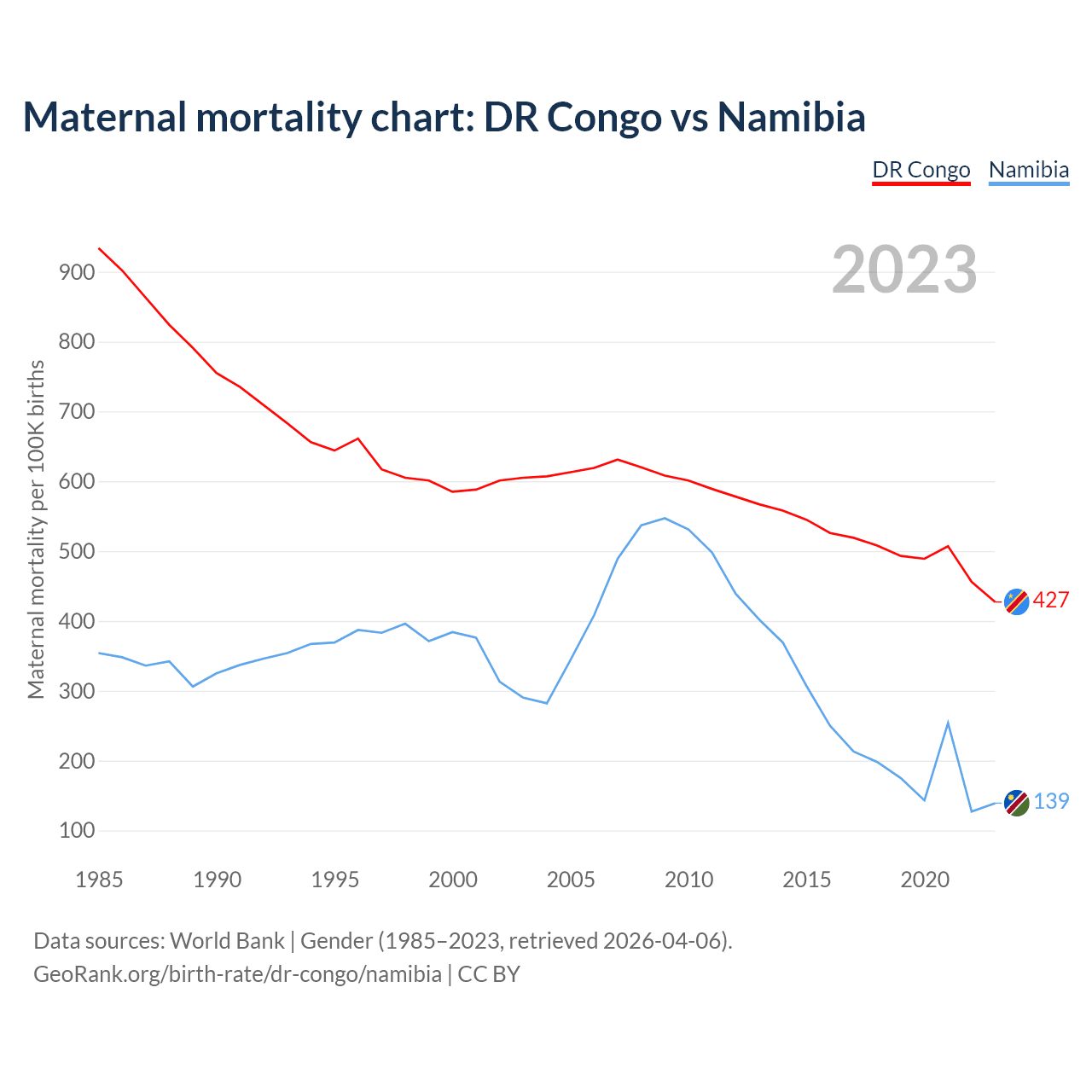 The maternal mortality rate, which is the probability of dying during childbirth or within 42 days of pregnancy termination, is 427 deaths per 100,000 live births in the DR Congo, compared to 139 deaths in Namibia.
