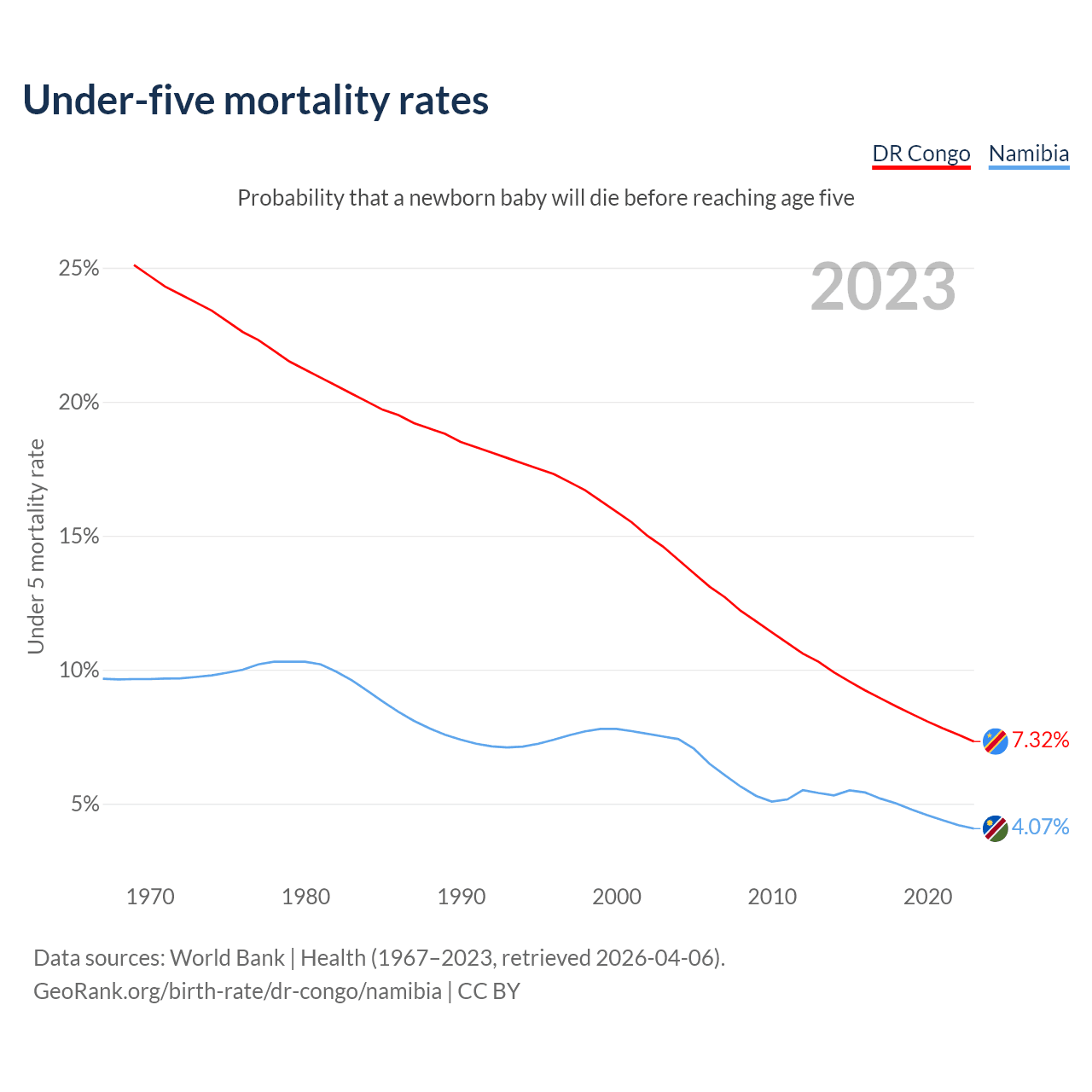 The chance that a newborn baby will die before reaching age five is 7.32% in the DR Congo and 4.07% in Namibia. Above is a chart with historical data on under-five mortality rates.