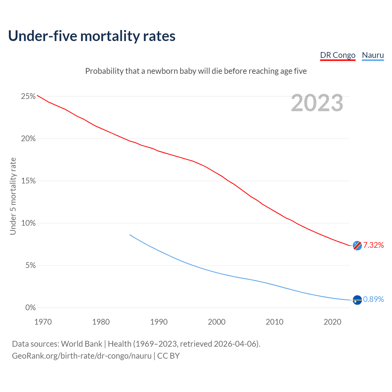 The chance that a newborn baby will die before reaching age five is 7.32% in the DR Congo and 0.89% in Nauru. Above is a chart with historical data on under-five mortality rates.