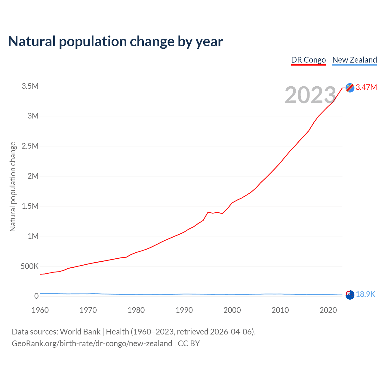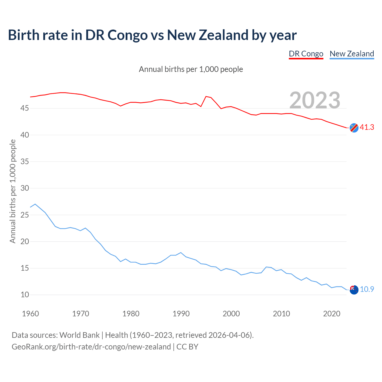The DR Congo has an annual birth rate of 41.3 births per 1,000 people, compared to 10.9 for New Zealand. The average number of children a woman is expected to have during her lifetime — the fertility rate, is 6.05 in the DR Congo and 1.56 in New Zealand — 74.2% difference.