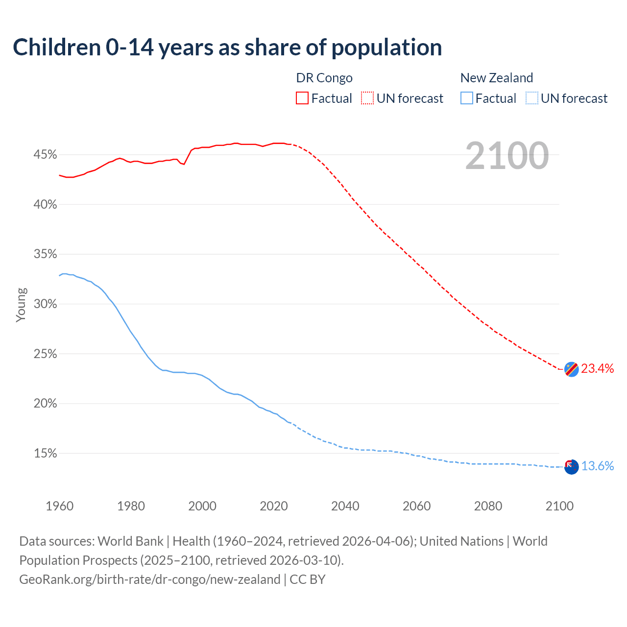 According to the latest available data on birth rates, the fertility rate in the DR Congo was 6.05 children per woman in 2023, compared to 1.56 in New Zealand in 2023. The replacement level is considered to be 2.1 children per woman.
