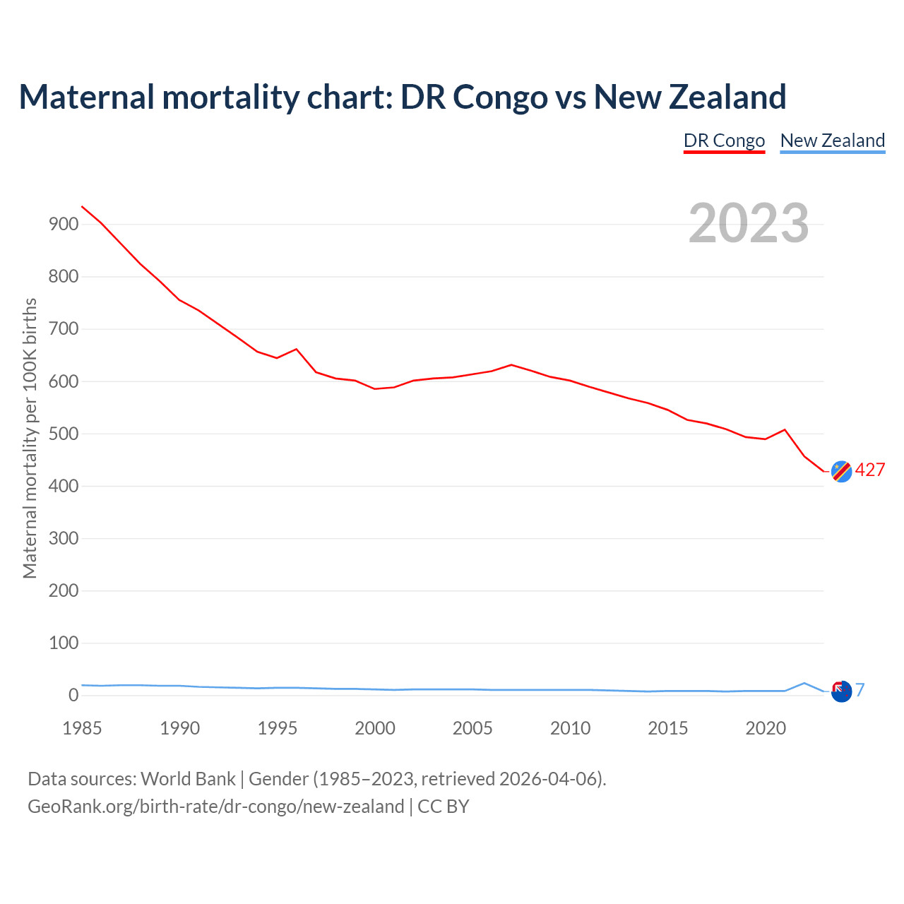 The maternal mortality rate, which is the probability of dying during childbirth or within 42 days of pregnancy termination, is 427 deaths per 100,000 live births in the DR Congo, compared to 7 deaths in New Zealand.