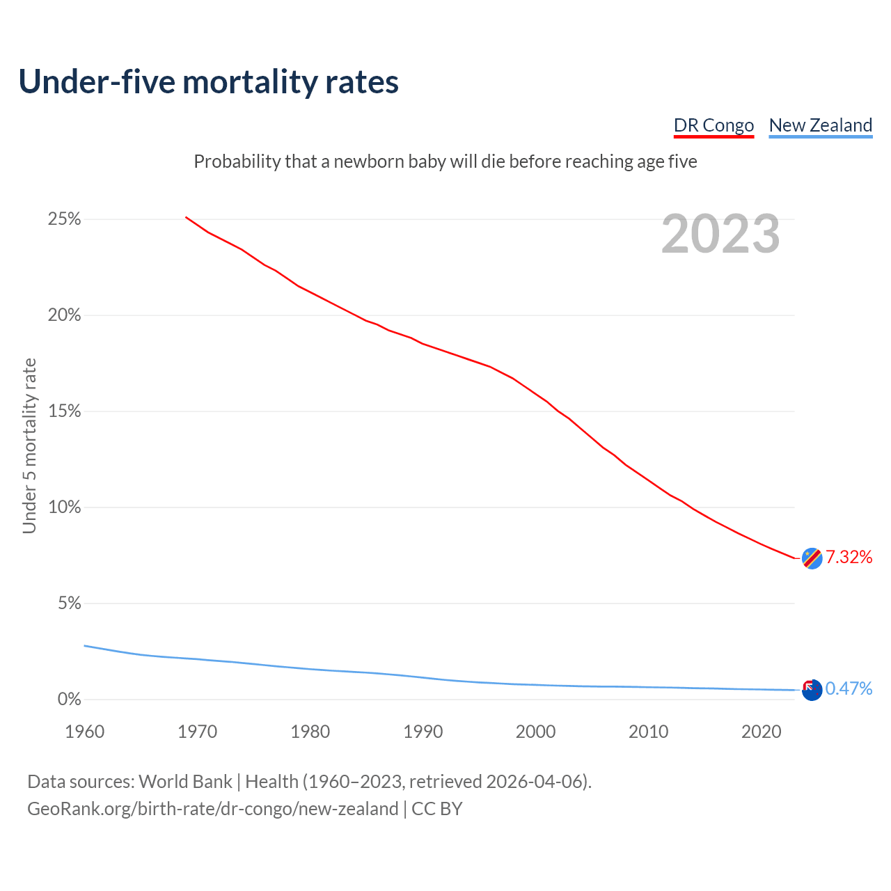 The chance that a newborn baby will die before reaching age five is 7.32% in the DR Congo and 0.47% in New Zealand. Above is a chart with historical data on under-five mortality rates.