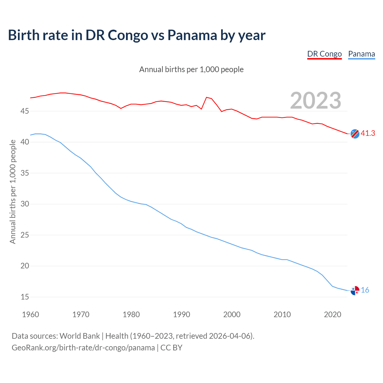 The DR Congo has an annual birth rate of 41.3 births per 1,000 people, compared to 16 for Panama. The average number of children a woman is expected to have during her lifetime — the fertility rate, is 6.05 in the DR Congo and 2.12 in Panama — 65% difference.