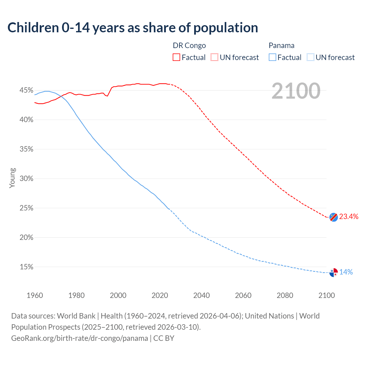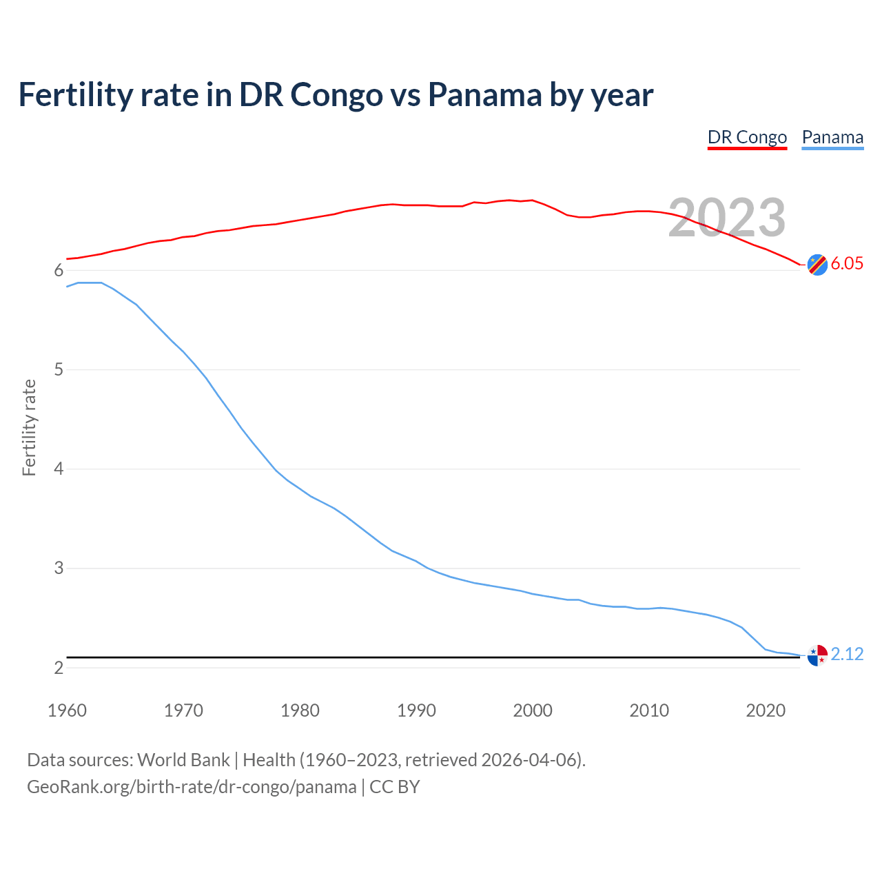 According to the latest available data on birth rates, the fertility rate in the DR Congo was 6.05 children per woman in 2023, compared to 2.12 in Panama in 2023. The replacement level is considered to be 2.1 children per woman.