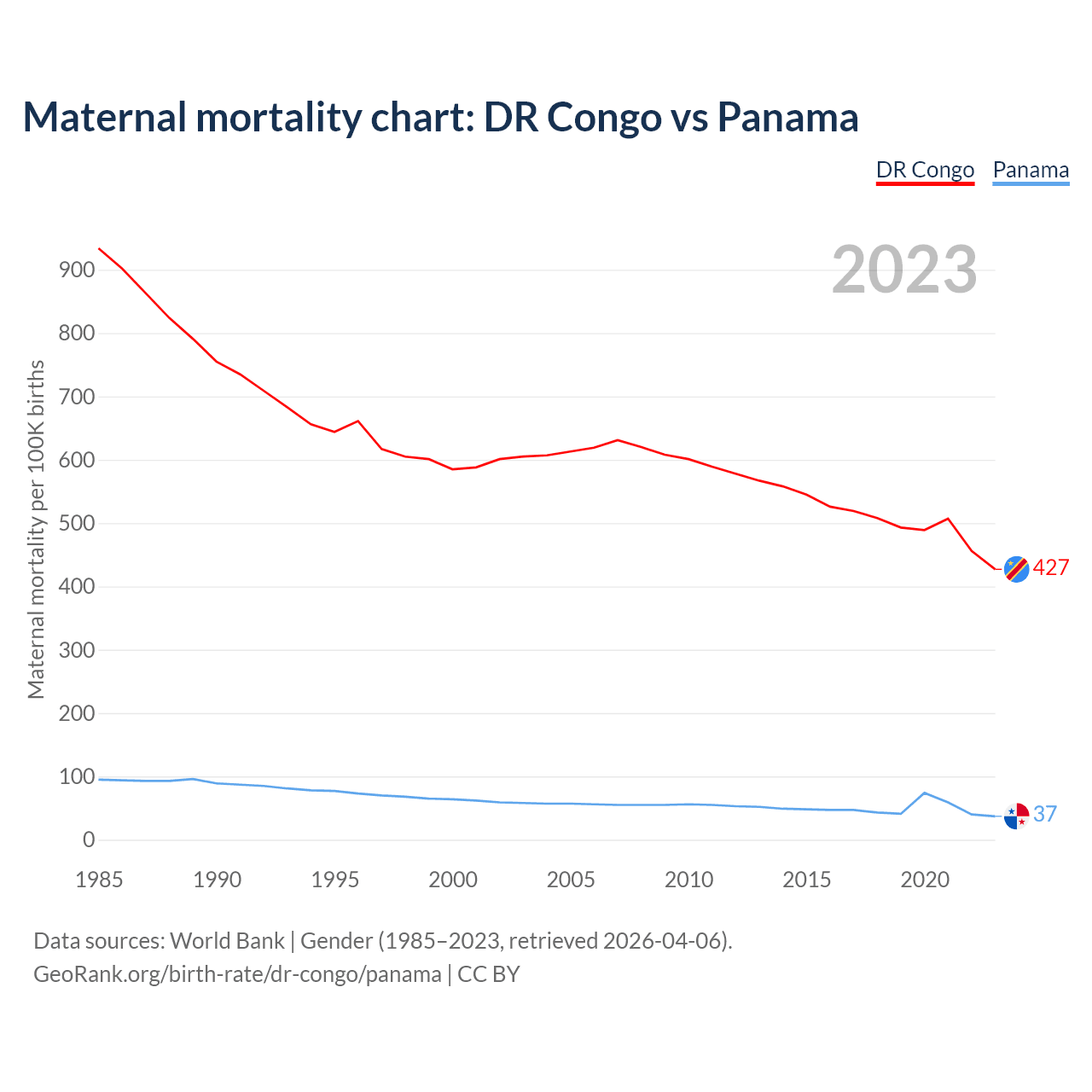 The maternal mortality rate, which is the probability of dying during childbirth or within 42 days of pregnancy termination, is 427 deaths per 100,000 live births in the DR Congo, compared to 37 deaths in Panama.