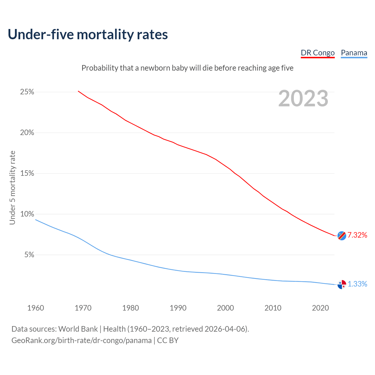 The chance that a newborn baby will die before reaching age five is 7.32% in the DR Congo and 1.33% in Panama. Above is a chart with historical data on under-five mortality rates.