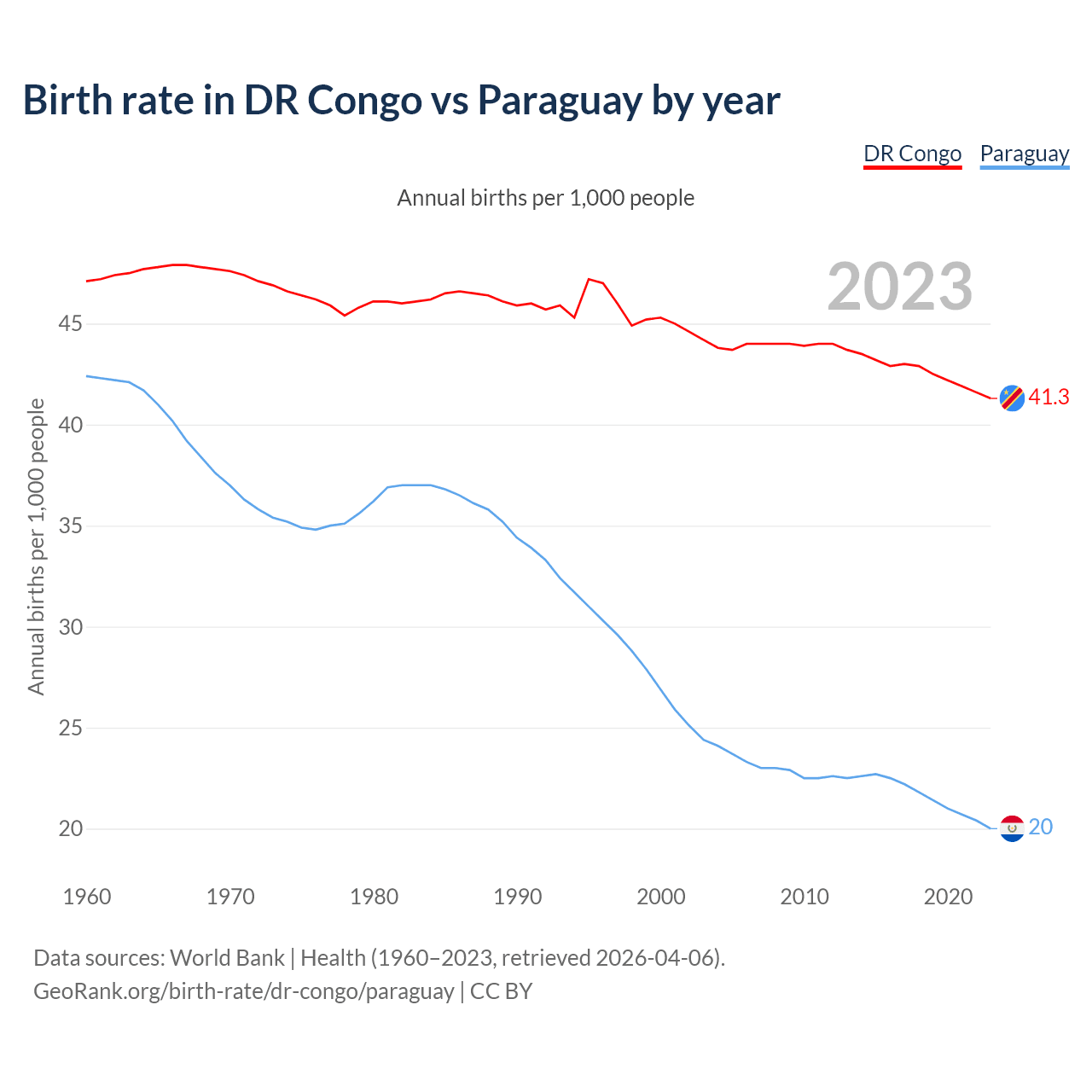 The DR Congo has an annual birth rate of 41.3 births per 1,000 people, compared to 20 for Paraguay. The average number of children a woman is expected to have during her lifetime — the fertility rate, is 6.05 in the DR Congo and 2.42 in Paraguay — 60% difference.